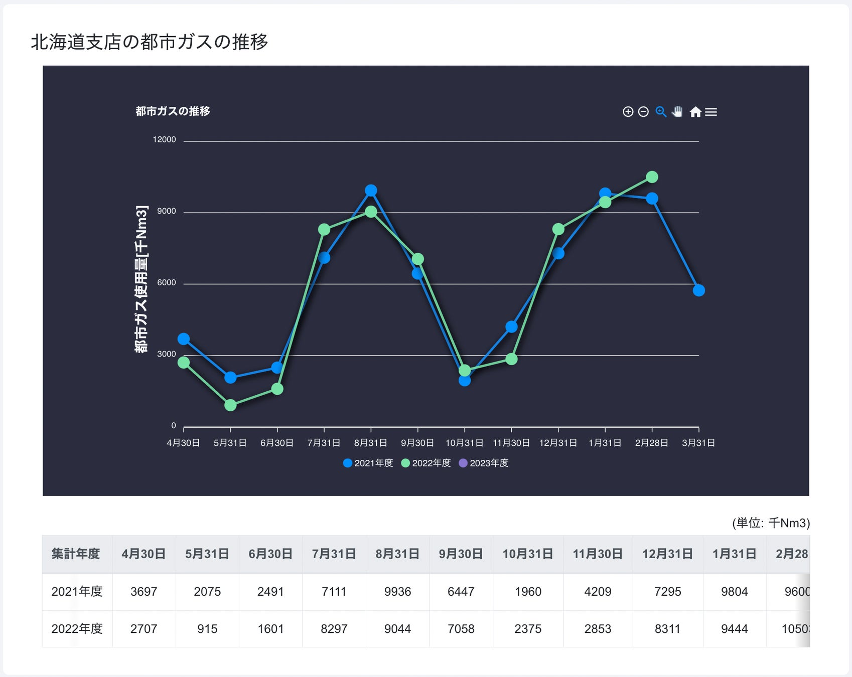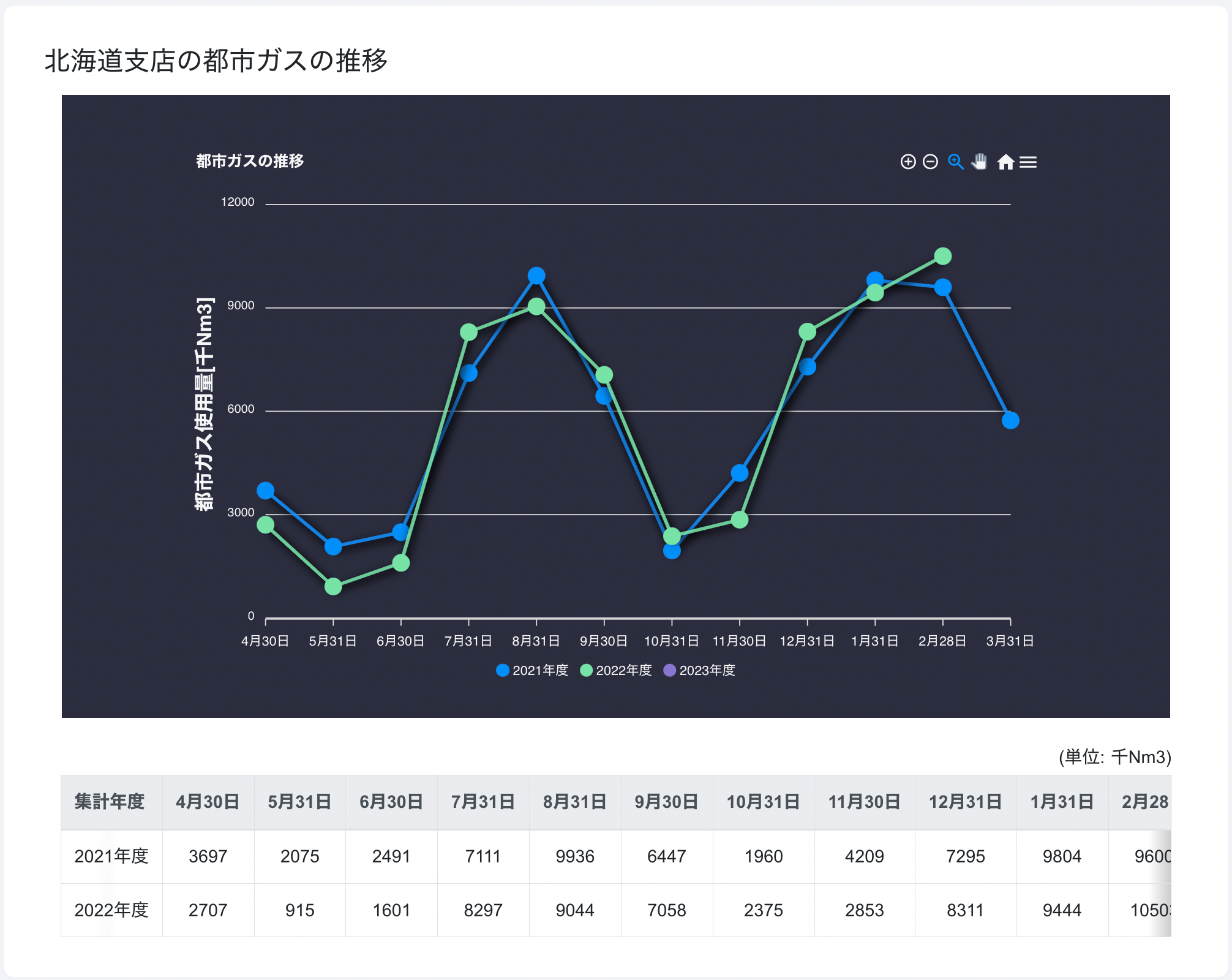 事業所別に各種エネルギー使用量の推移を簡単に可視化します。日々事業所のデータをモニタリングすることで振り返りも簡単に行えます。