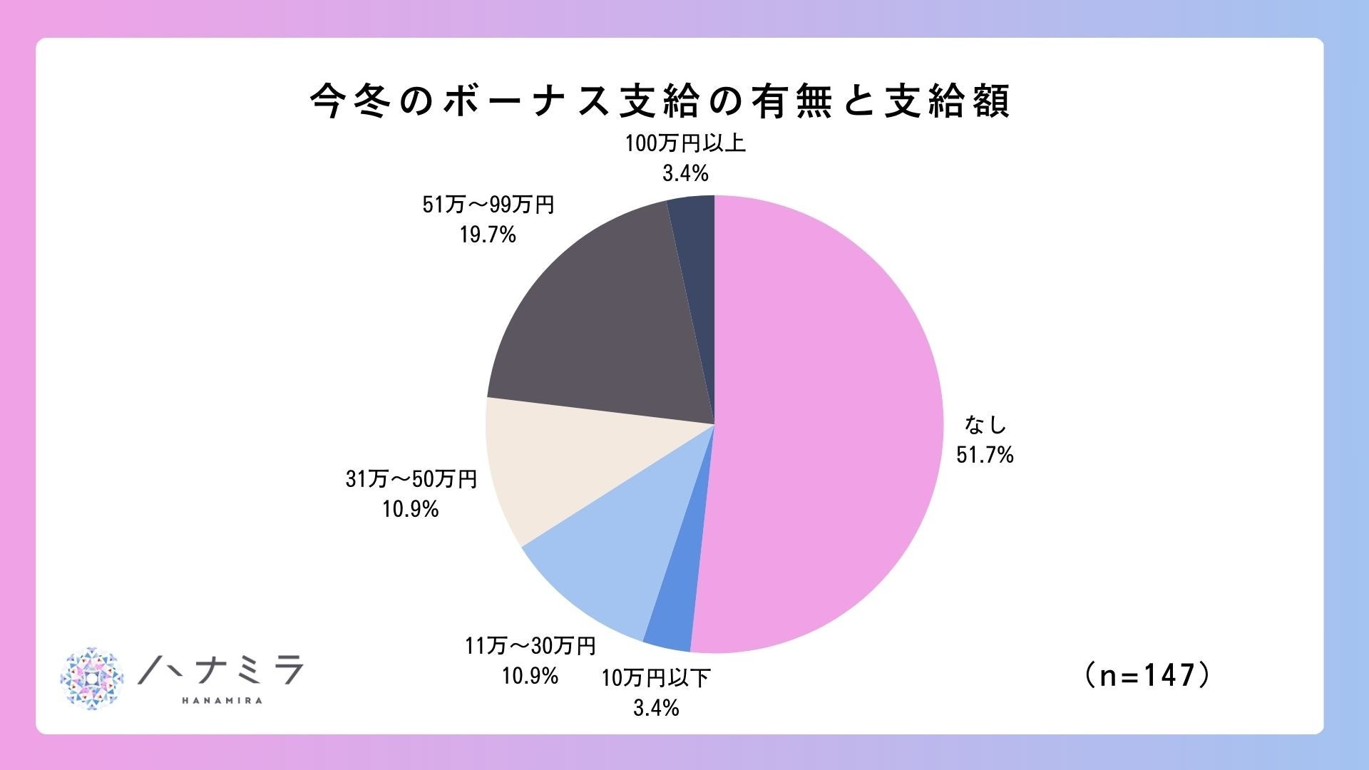 今年の冬のボーナスについては、およそ半数(48.3%)が「支給がある」と回答しました。 ボーナス支給金額は、もっとも多い回答は51〜99万円(19.7%)、その次に31〜50万円(10.9%)、 11〜30万(10.9%)でした。