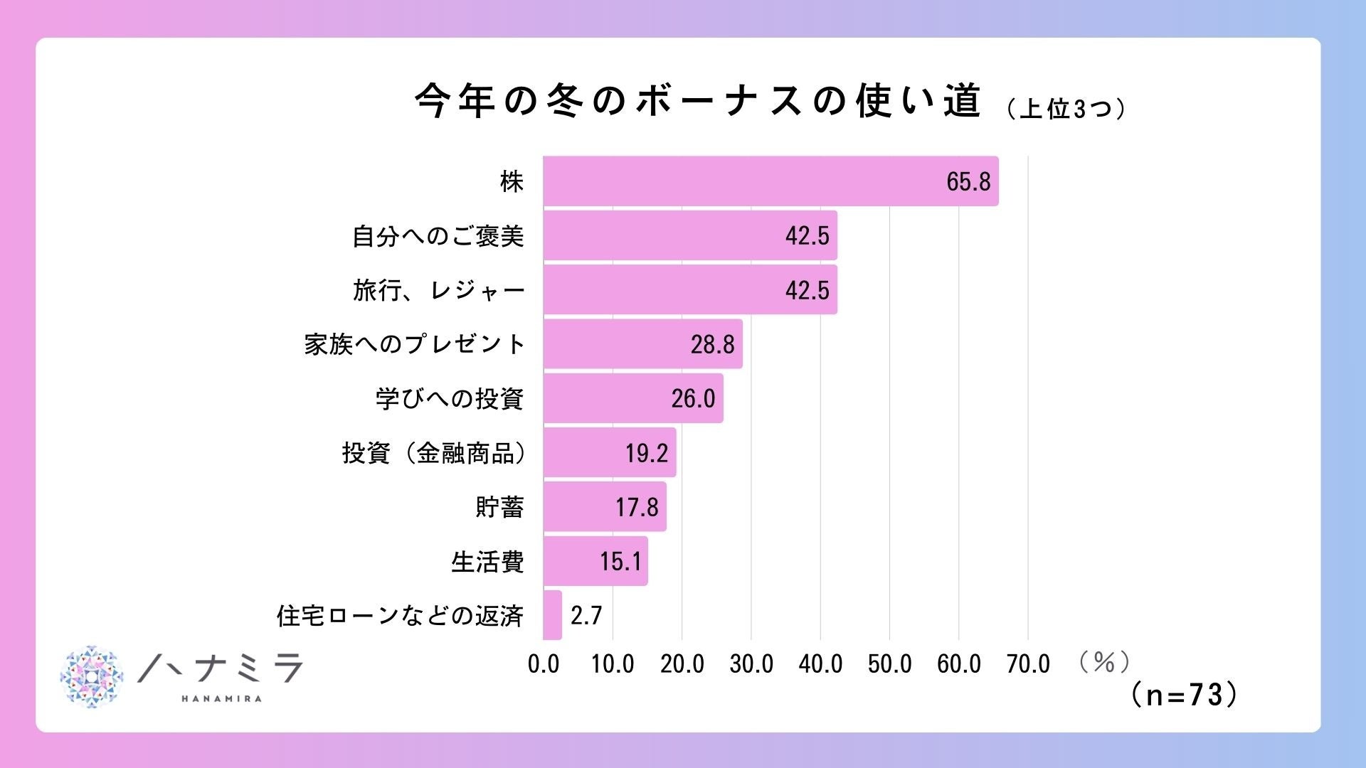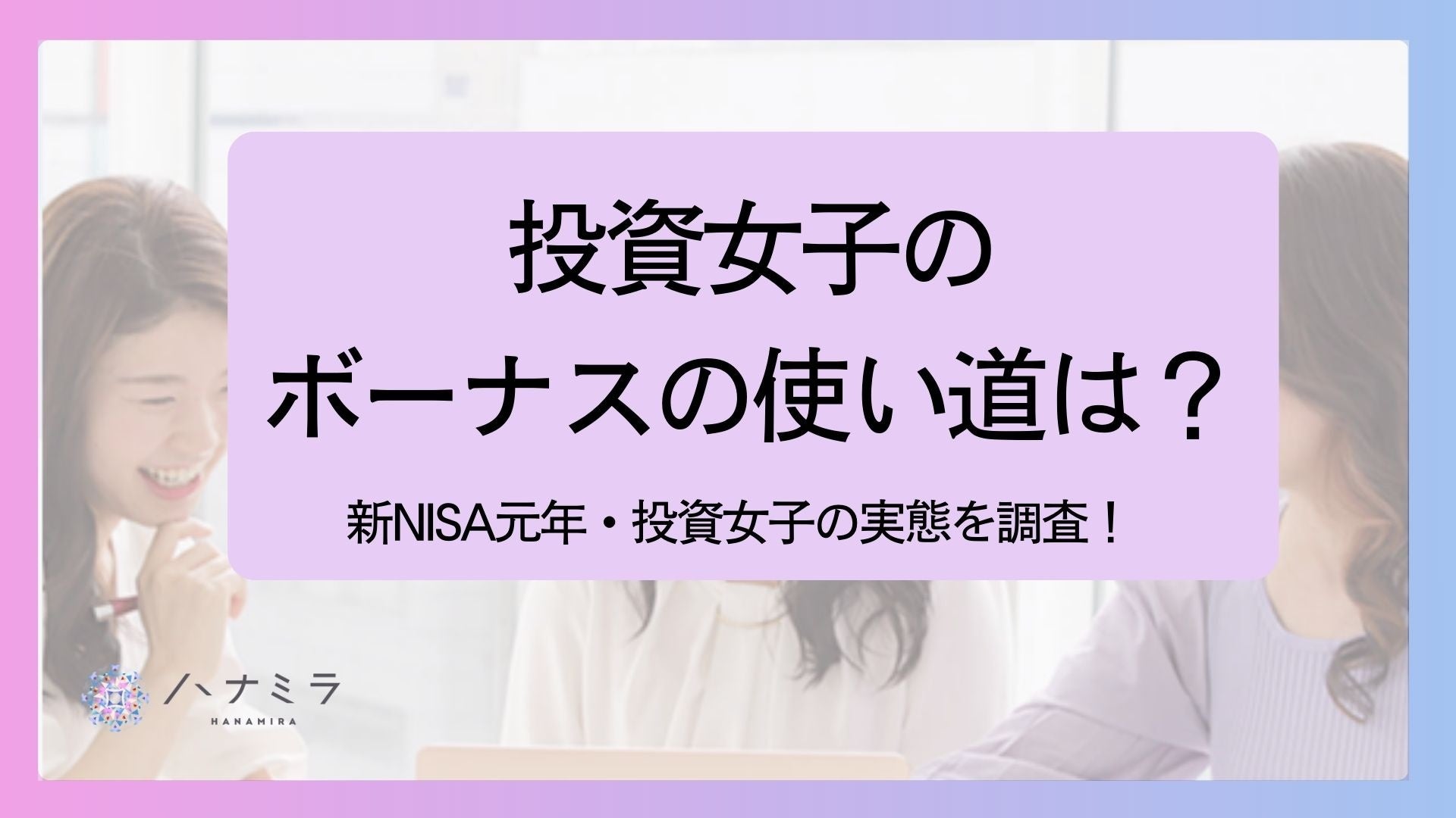 物価高が続く中、まもなく冬のボーナス時期です。将来への備えとして新NISAに注目が集まった2024 年、投資を始めた女性たち(=投資女子)はボーナスをどのように使うのでしょうか? 女性向け資産運用スクールを運営する株式会社ハナミラ(所在地:東京都港区、代表取締役:松下り せ、以下「ハナミラ」)は、ハナミラ受講生の投資女子147名に対し、ボーナスの使い道をテーマにし たアンケート調査を11月20日(水)〜11月30日(土)に実施したところ、投資女子のボーナスの使い道 は、一般的な使い道とは異なることがわかりました。株投資を始める前のボーナスの使い道は、1位: 貯蓄、2位:自分へのご褒美、3位:旅行・レジャーだったところ、株投資を始めてからは、1位:株、 2位:自分へのご褒美、3位:学びへの投資、という結果となりました。