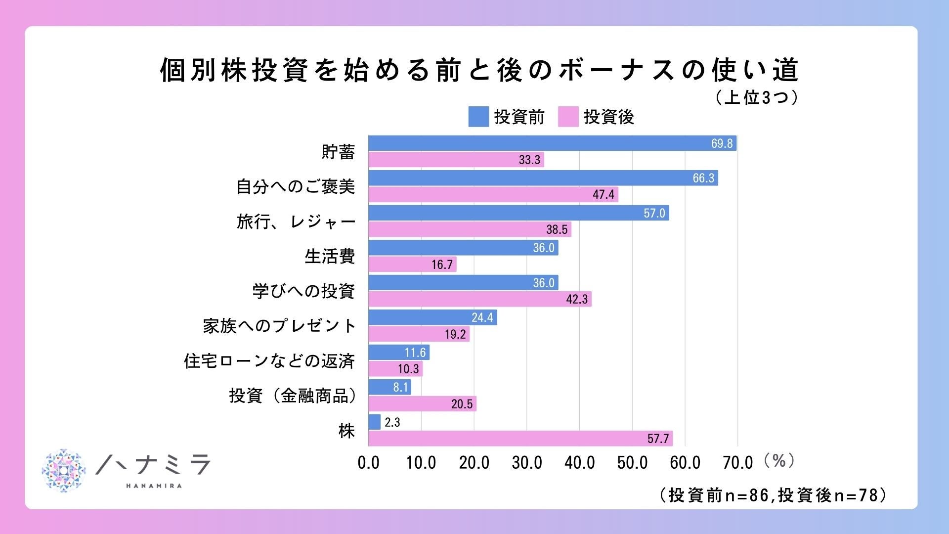 (2)個別株投資を始める前のボーナスの使い道は「1位:貯蓄(69.8%)、2位:自分へのご褒美 (66.3%)、3位:旅行・レジャー(57.0%)」だったが、個別株投資を始めてからは、「1位:株 (57.7%)、2位:自分へのご褒美(47.4%)、3位:学びへの投資(42.3%)」に変わった。