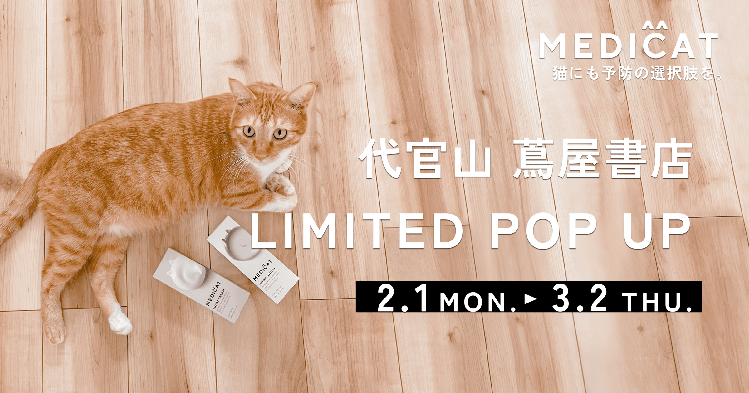 “猫に予防の選択肢を。”というコンセプトのもと、猫の皮膚を徹底的に研究し、皮膚バリアを整える猫の未病・予防ブランド「MEDICAT」は、2023年2月1日(水)〜2023年3月2日(木)の1ヵ月間、代官山 蔦屋書店にてポップアップイベントを開催いたします。さらにコラボレーション企画として、猫好きのための猫雑学「にゃんこ検定」も実施いたします。