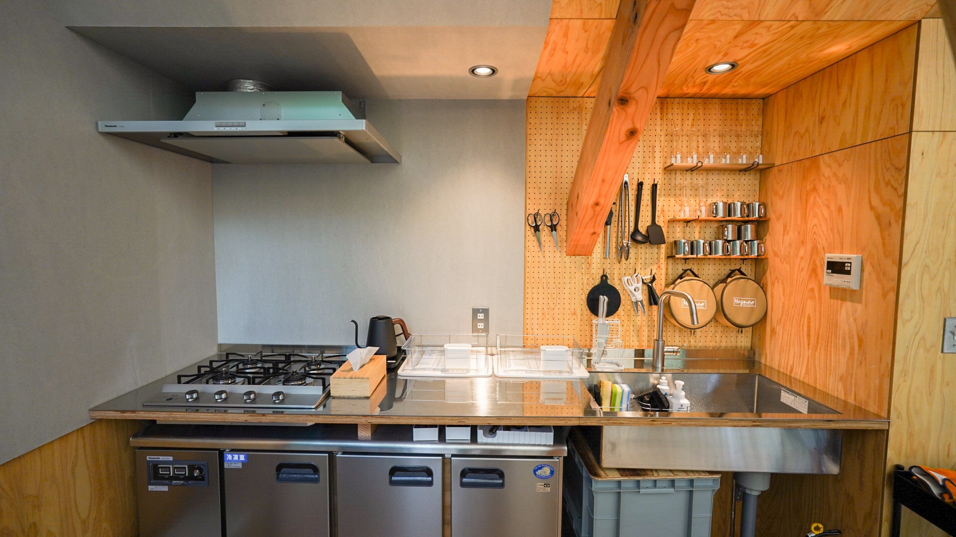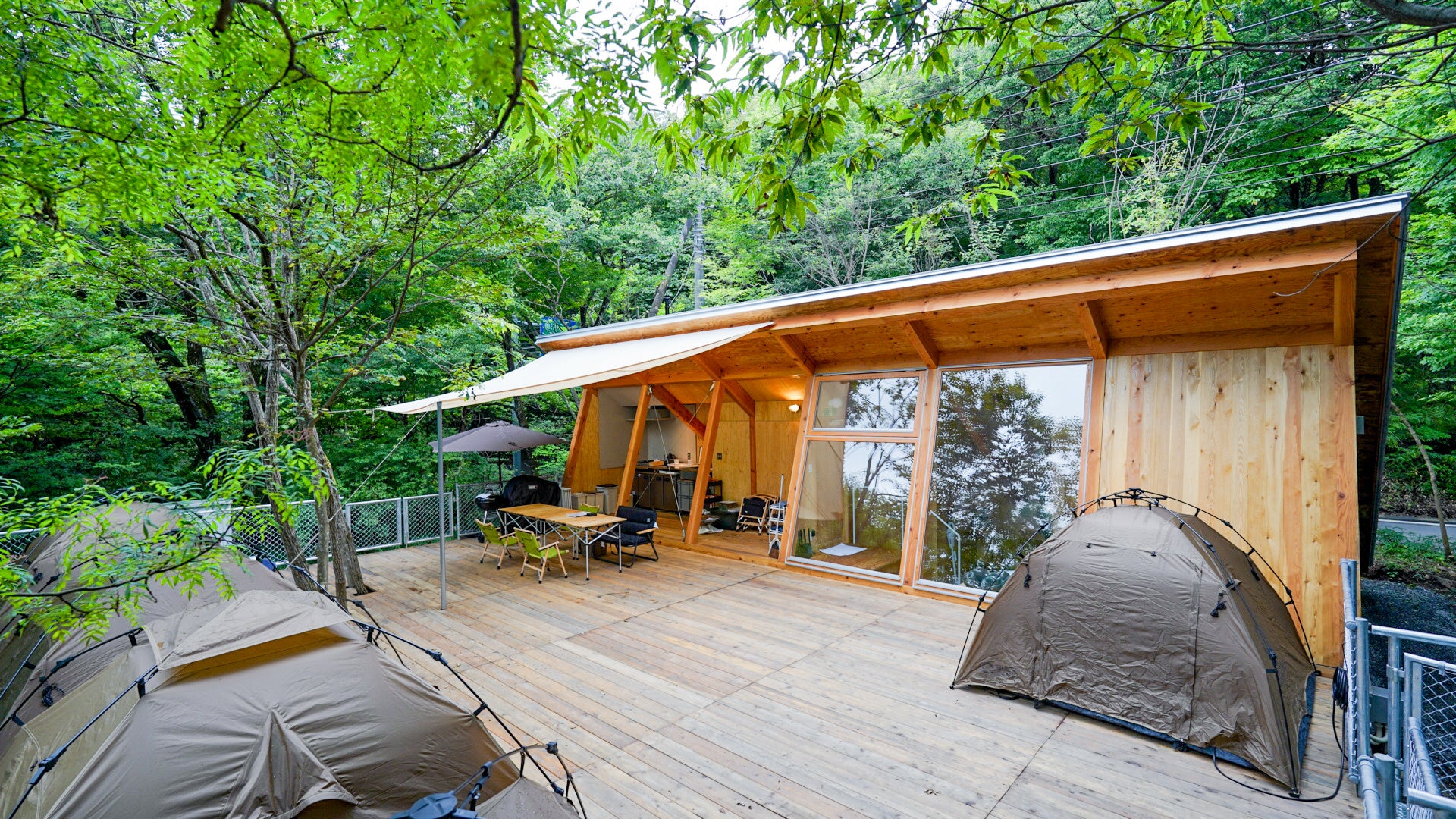 なお、施設内にある生活棟には清潔で快適なトイレ・シャワーが各2つずつ、エアコンも2機設置しており、更にフリーwifi、テレワークスペースも完備しております。デッキ上にはキッチン・電気のBBQコンロを設置し、アウトドア初心者の方でも安心してキャンプ体験ができるようになっております。