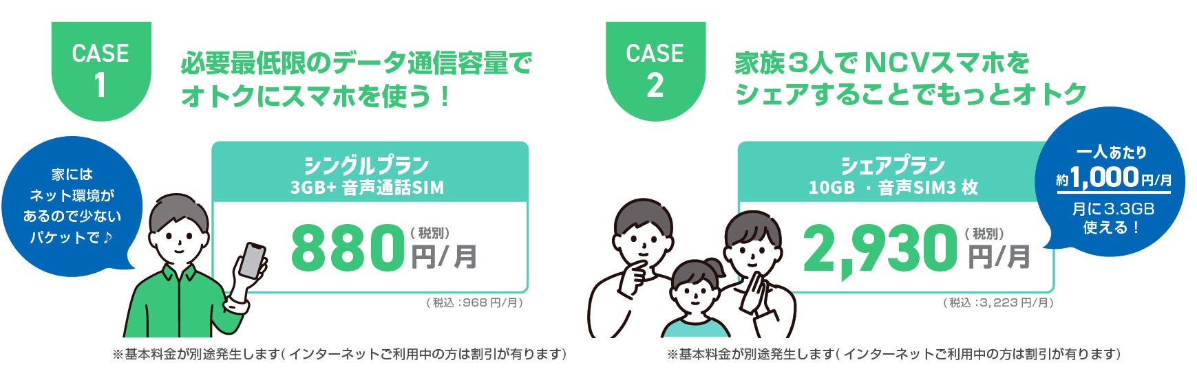 「NCVスマホ」は、一般的にお客さまが利用される月の想定ギガ数と、NCVサービスエリア内における家族同居率などを独自に調査・分析した結果をプランに反映し、ご家族でのご利用を想定した「シェアプラン」を新設いたします。個人で利用される「シングルプラン」と、ご家族でギガ数をシェアできる「シェアプラン」から選んでご利用いただく事が可能となります。