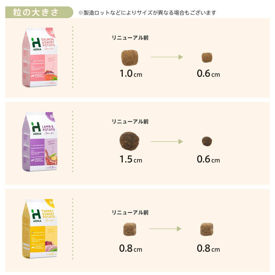 そしてこの度、そのご要望にお応えし、「サーモン」「ラム」の2種を0.6-0.8cmの小粒サイズへとリニューアル。