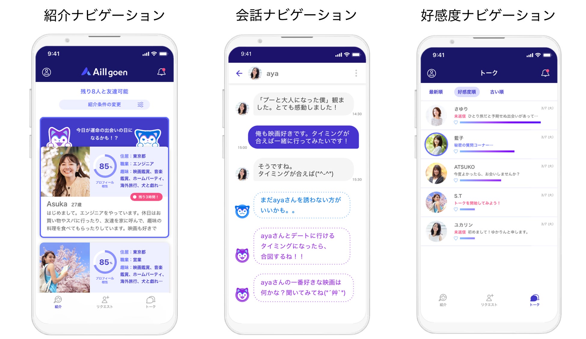紹介ナビゲーション、会話ナビゲーション、好感度ナビゲーションという3つのAIナビゲーション機能によって、男女のコミュニケーションのすれ違いを緩和します。さらに自分では直接言いづらいこともAIが自然と代弁するなど、共通の友達の役割も担います。