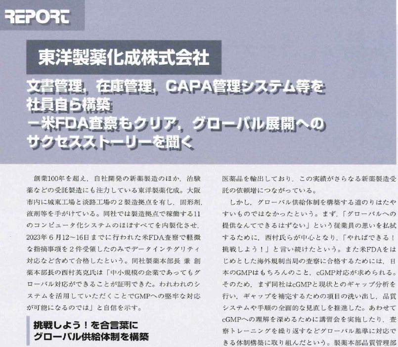 【REPORT】に「文書管理,在庫管理,CAPA管理システム等を社員自ら構築 ―米FDA査察もクリア,グローバル展開へのサクセスストーリーを聞く」 というタイトルで記事が掲載されました。