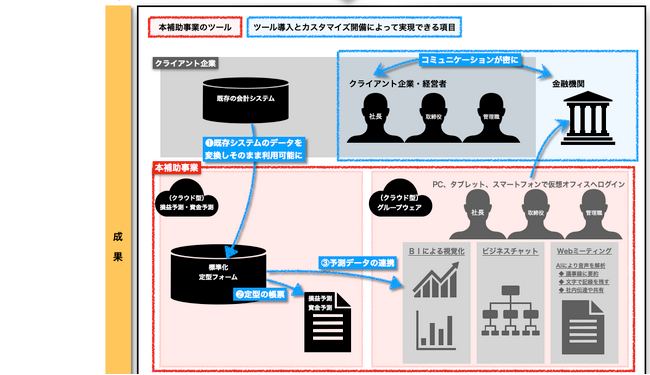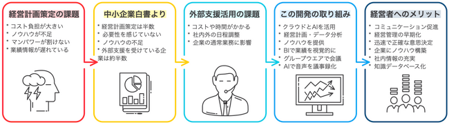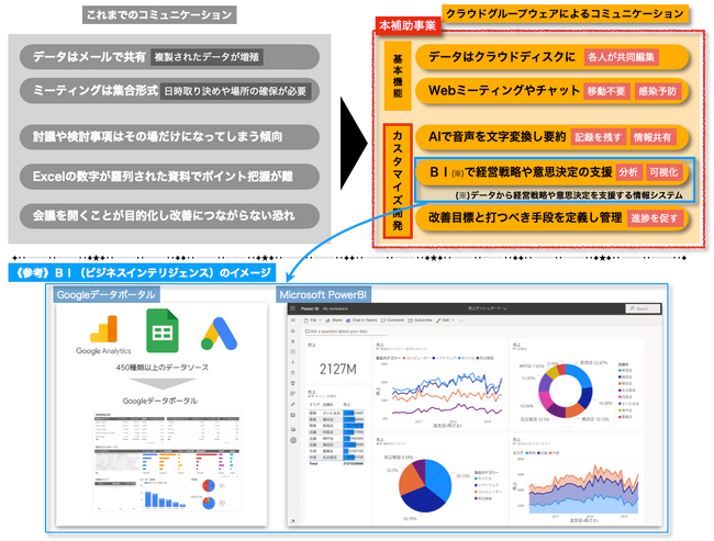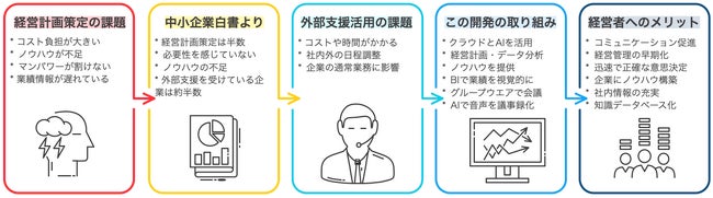 上記のような課題に対して、クラウドとAIを活用して、経営計画やデータ分析のノウハウを提供しています。BI(ビジネスインテリジェンス)で業績を視覚的に表現し、グループウエアで会議などコミュニケーションを効率化し、AIで音声を議事録化することもをスコープにします。これらのサービスメニューは、ビジネスの成長に貢献すると確信しています。経営者へのメリット
