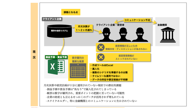 クラウド型の業績シミュレーションの仕組みをベースに、クライアント企業のニーズに合わせてカスタマイズすることで、損益計画から資金計画までを一貫して算出する計算ロジックを基に、帳票作成も自動化します。また、複数の経営シナリオを同時に比較分析することで経営者の意思決定をサポートする環境を提供します。この仕組みは、既存の会計システムと連携し、仕訳明細データにトレンドや前年比を勘案した予測を生成することで、会計システムの変更や多額の追加投資なしに導入できます。さらに、月次決算が未完了であっても、速報ベースで損益や資金繰り予測を作成・更新することを可能とします。これにより、企業は、常に最新かつ正確な業績情報により、迅速な経営判断ができます。定性的情報(数値以外について)