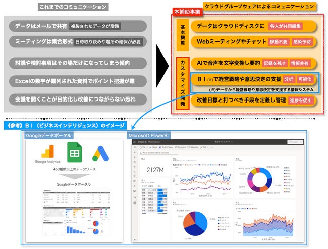 クラウド型のグループウエアをカスタマイズし、企業がコミュニケーションや知識管理の課題を解決します。グループウエアでは、Web会議やチャットを利用して、時間や場所に制約されない柔軟なコミュニケーションが実現でき、さらに、AIを活用して、チャットや音声を自動的に議事録化し、会議の内容を社内記録として残すことができます。これらにより、会議に参加できなかった人とも情報共有がスムーズになり、また、グループウエア上でクライアント企業の業務マニュアルをオンラインで作成することで、業務知識の蓄積や社員教育の効果を高めることができます。さらに、BI(ビジネスインテリジェンス)を用いて、業績やKPI(重要業績評価指標)などを視覚的に表示することで、経営者や管理者の意思決定をサポートすることができます。これらのカスタマイズにより、クラウド型のグループウエアは、クライアント企業の社内情報と知識データベースの充実に貢献します。