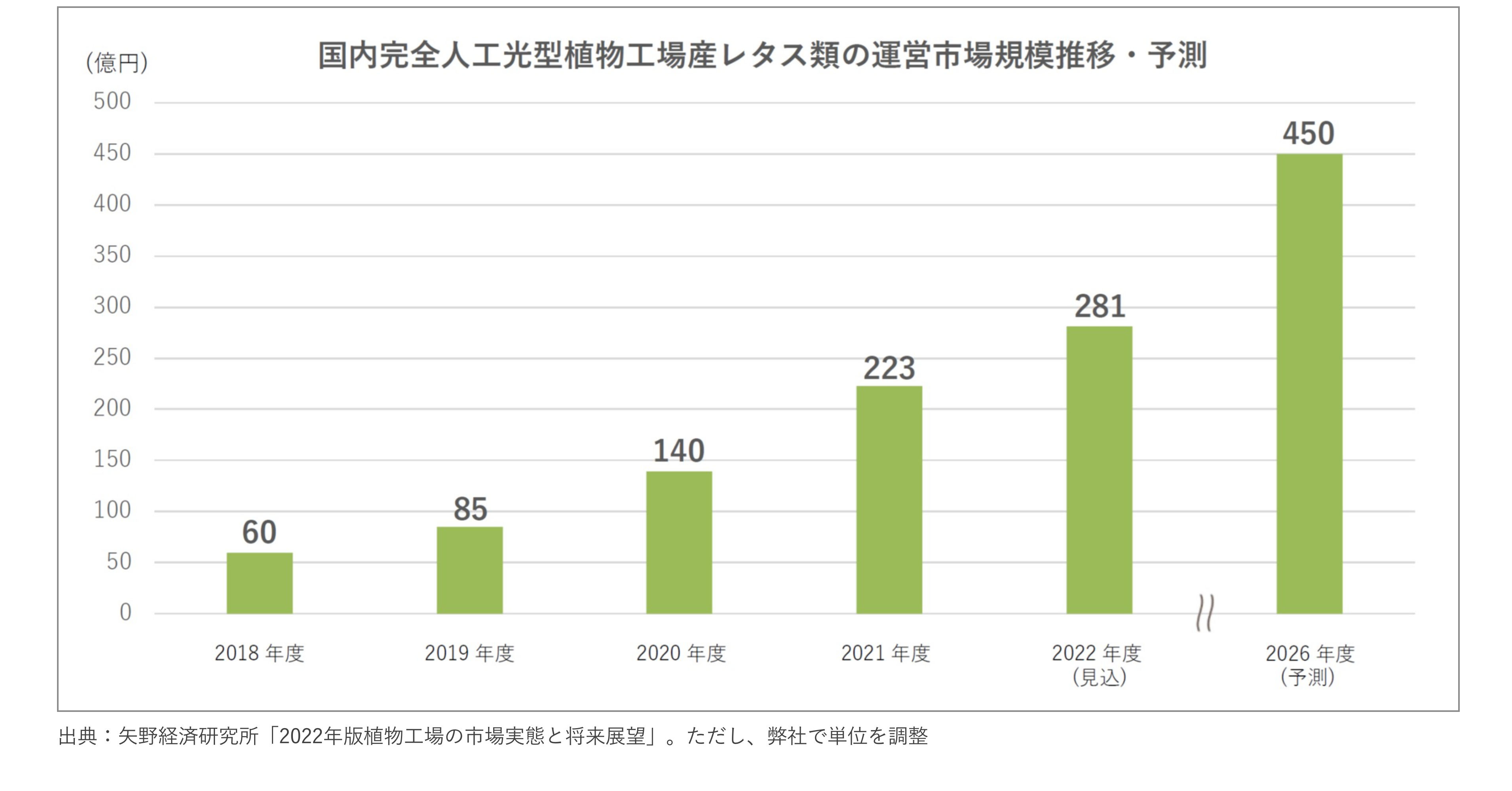 今では多くのスーパーマーケットで売場に並ぶ植物工場産レタスですが、その市場規模は2022年に約280億円、2026年までには450億円になると予測されており、市場拡大が見込まれています※3。