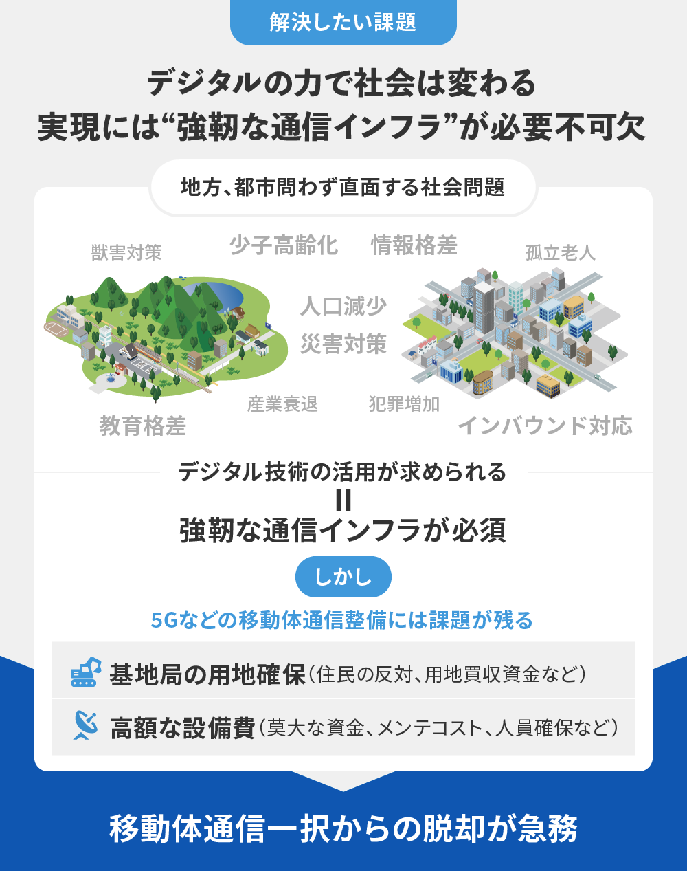 短期間で強靭な通信インフラを整備することで、デジタル技術を活用したスーパーシティ(※)実現を牽引していきます。(※「スーパーシティ」とは、AIやビッグデータを活用し、行政手続・移動・医療・教育など幅広い分野で生活の利便性を向上させ、住民目線でより良い暮らしが実現できる都市のことを指します。)