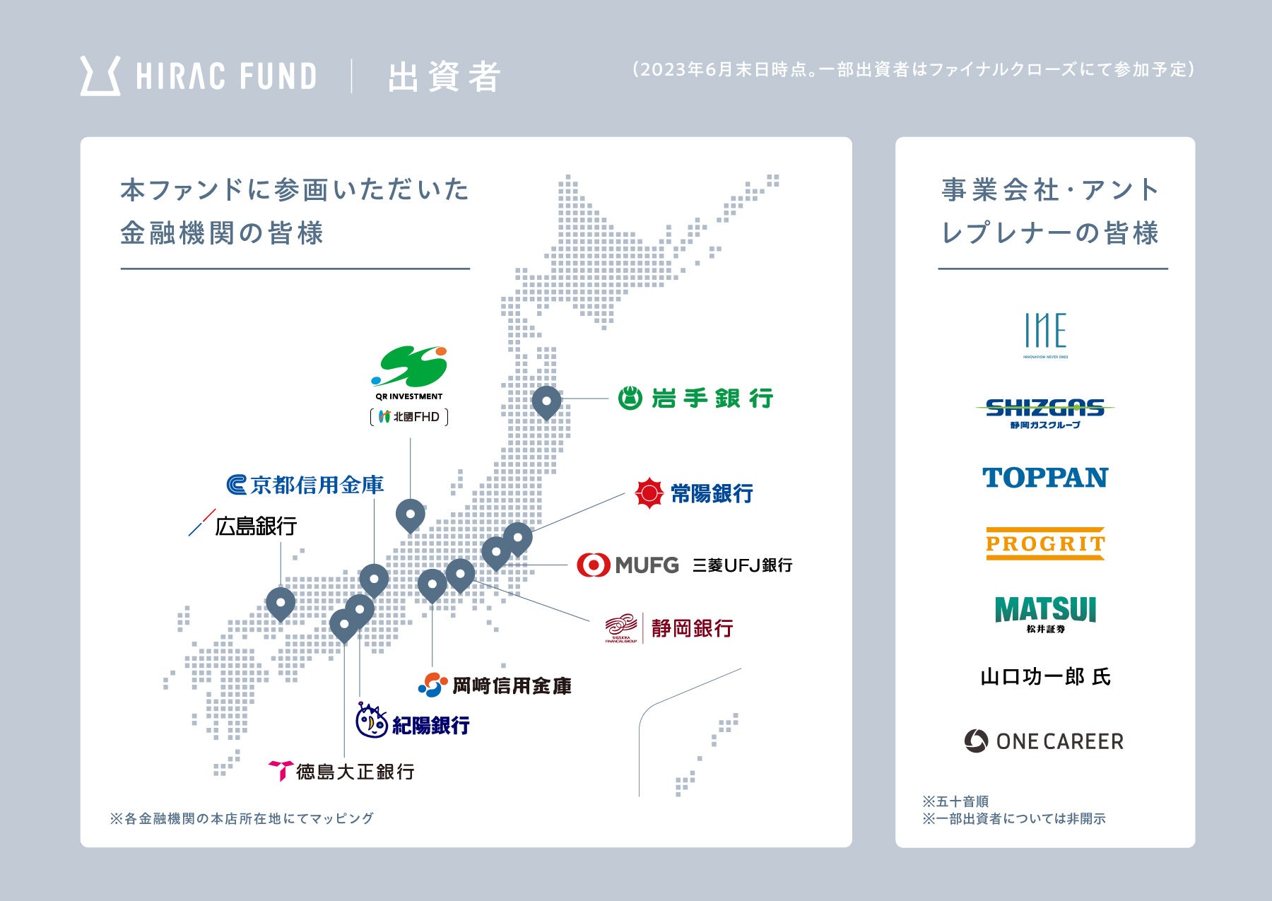 新たに株式会社三菱UFJ銀行、地域金融機関の出資者として株式会社岩手銀行、京都信用金庫、株式会社静岡銀行(HIRAC FUNDの1号ファンドから継続参画)、株式会社常陽銀行、株式会社徳島大正銀行、株式会社広島銀行が参画し、株式会社QRインベストメント(株式会社北國フィナンシャルホールディングス子会社)がファイナルクローズにおける参画を予定しております。また、事業会社の出資者として株式会社I-ne、静岡ガス株式会社、凸版印刷株式会社、株式会社プログリット、松井証券株式会社(HIRAC FUNDの1号ファンドから継続参画)に新たに参画いただきました(それぞれ五十音順・一部出資者は非開示)。