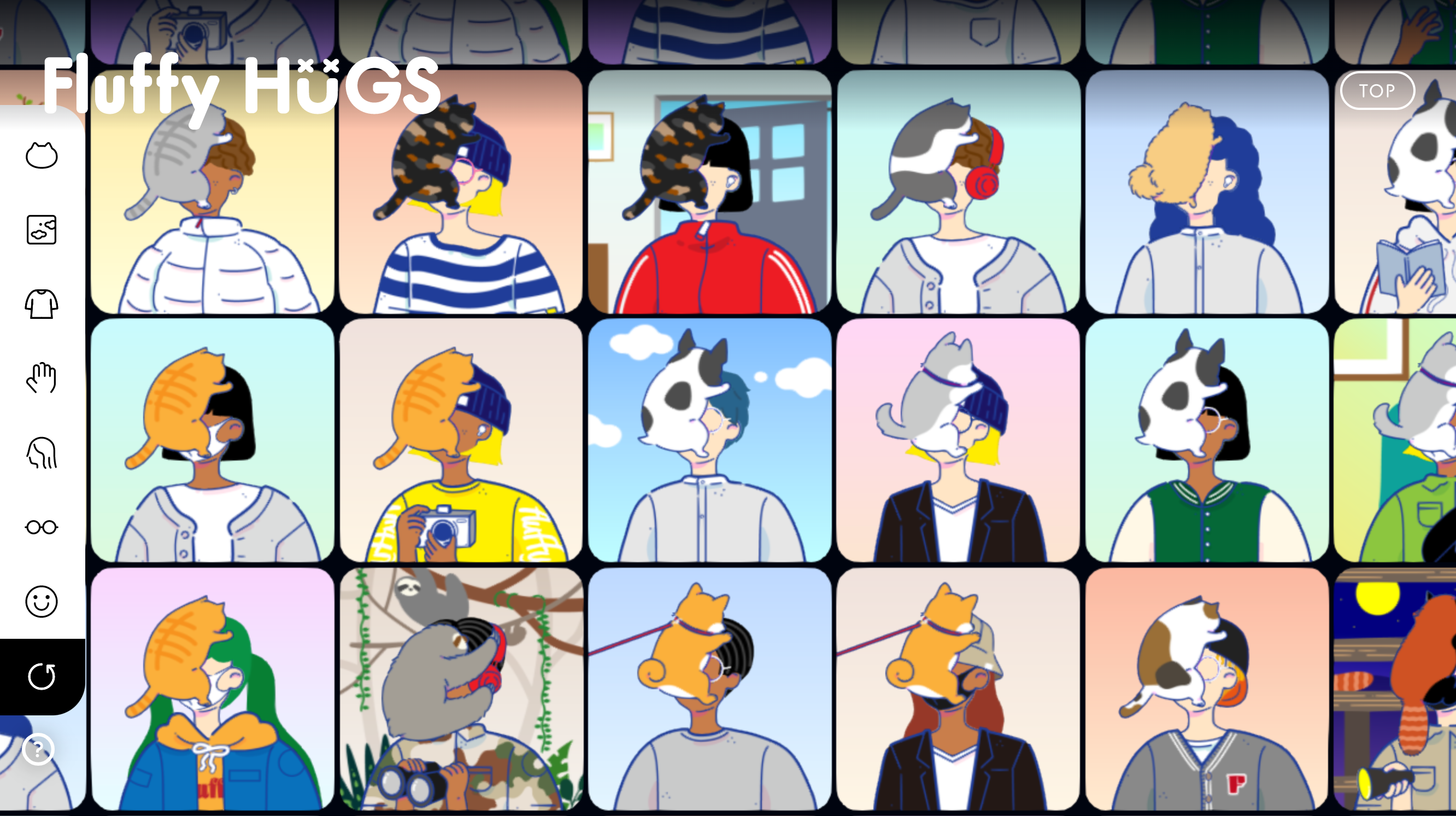 スペシャルサイトでは、3,333体の『Fluffy HUGS』の多様性を体験できるコンテンツも同時公開。背景、動物、人物、服装、手に持つ小物などを自由に選択でき、自分の保持するNFTを探せたり、これから手にしたいNFTも見つけられます。