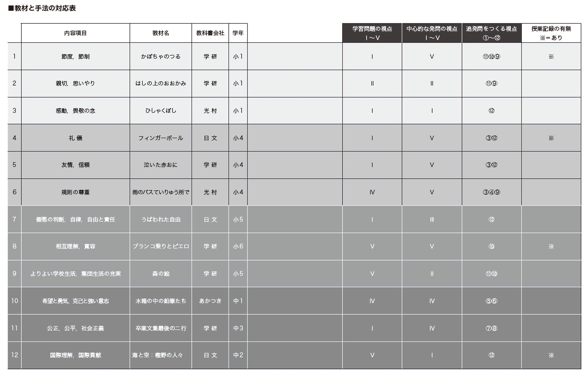 教材と手法の対応表