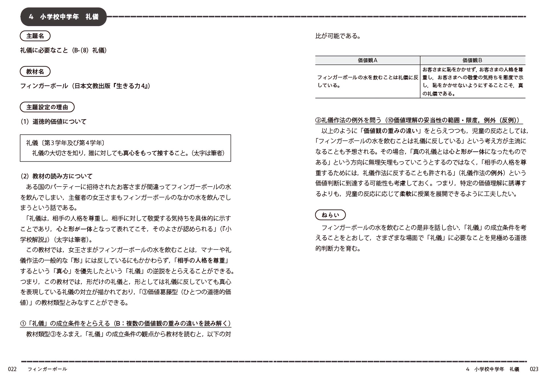 たとえば「小学校中学年 礼儀」の「フィンガーボール」の場合,第2章で取り扱う教材類型のうちの③価値葛藤型の教材類型とみなすことができ,さらに「教材の読み方B:複数の価値観の重みの違いを読み解く」を軸に教材をとらえつつ,礼儀作法の例外について考えることによって一般の価値理解のみにとどまらない,個別状況下での判断力を育む発問のための指導案を提示しています。