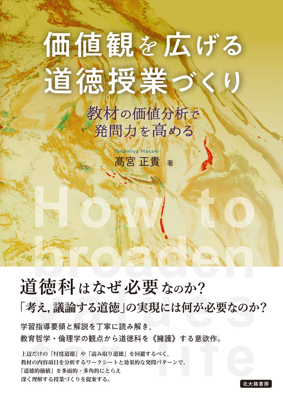 本書『道徳的判断力を育む授業づくり』は著者の一人である教育哲学・道徳教育学研究者の髙宮正貴氏(大阪体育大学教育学部准教授)による前著『価値観を広げる道徳授業づくり:教材の価値分析で発問力を高める』(北大路書房,2020年,https://www.kitaohji.com/book/b581652.html)の内容に基づいた道徳の授業づくりを展開しています。
