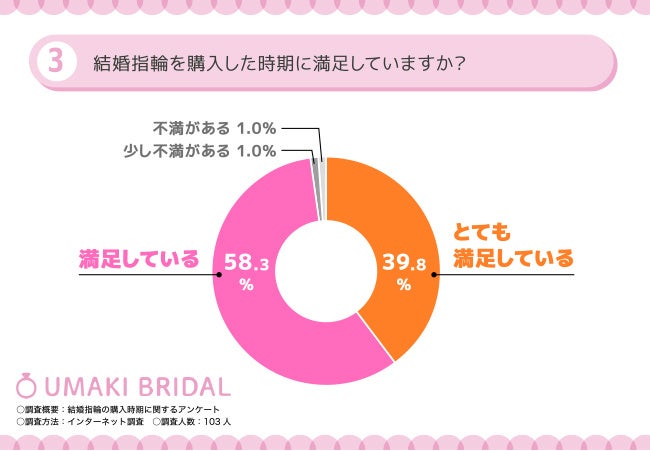 この調査から結婚指輪の購入時期に対する満足度はきわめて高く、不満がある方はごく少数であり、自身の行動に後悔を残していないことがわかりました。