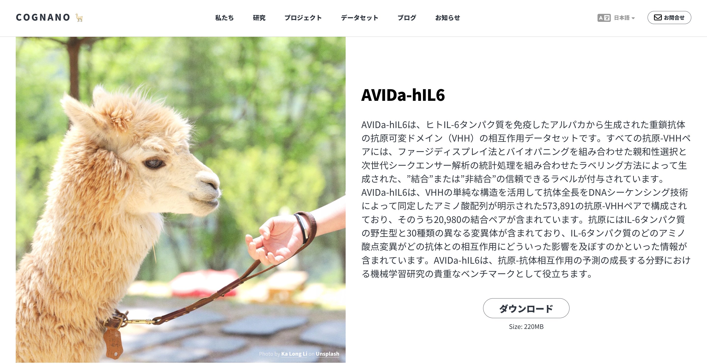 生きたアルパカの免疫システムを利用した新たなデータセット作成手法を提案しました。AVIDa-hIL6はヒトIL-6タンパク質を抗原として採用しましたが、提案するデータセット作成手法は、あらゆる標的抗原に対して適用可能です。そのため、本手法は今後より大規模かつ網羅的な抗原抗体相互作用データセットを作成する上での基盤技術になります。実際に、我々は新型コロナウイルスの表面に存在するスパイクタンパク質を標的抗原として同様の手法でデータセットを作成し、有効な抗体の発見に成功しています。