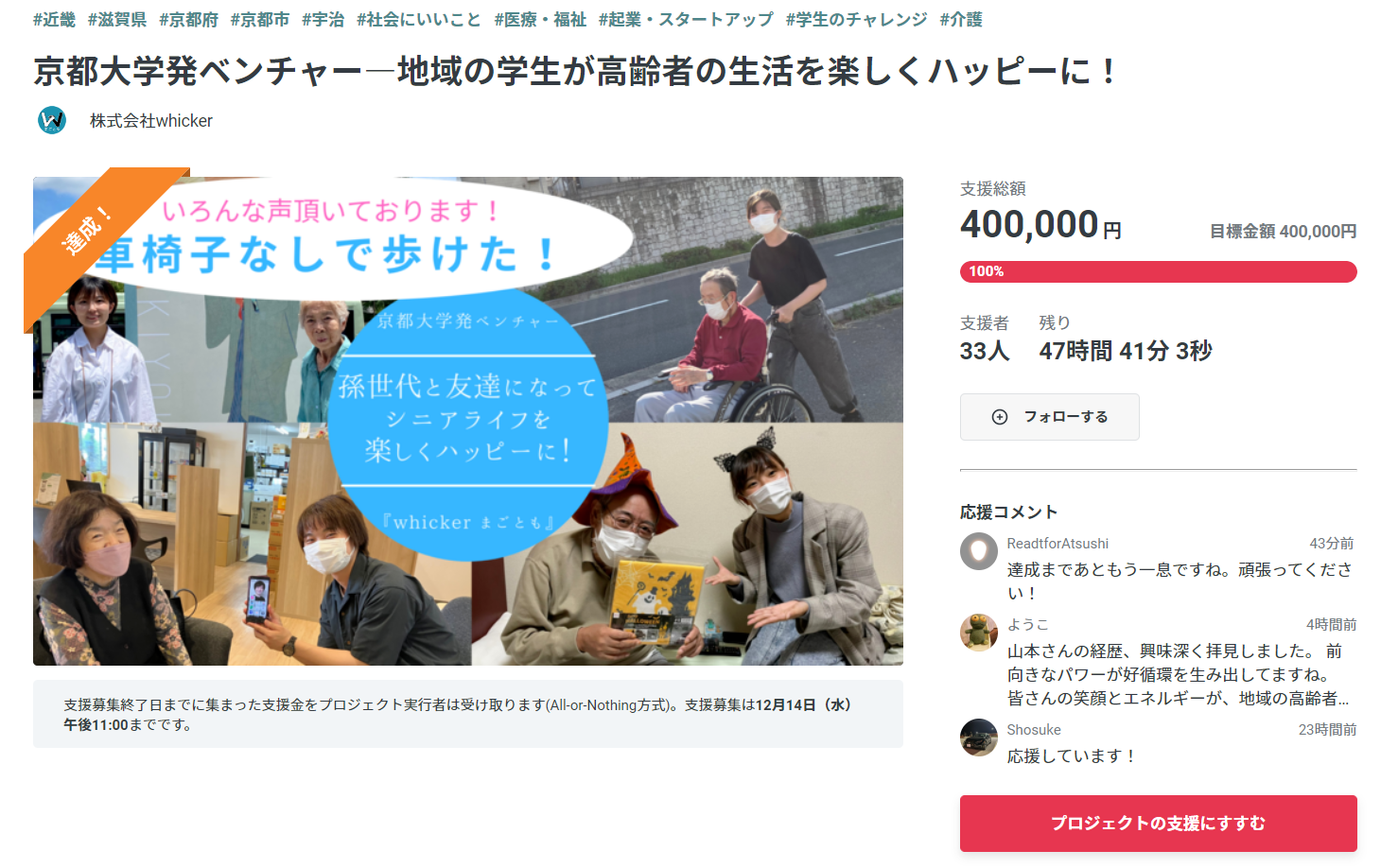 2022年12月12日(月)、京都大学発ベンチャー企業whickerが運営する『まごとも』は、クラウドファンディングサイト「READYFOR」にて挑戦したクラウドファンディングにて、目標金額の40万円の調達に成功しました。