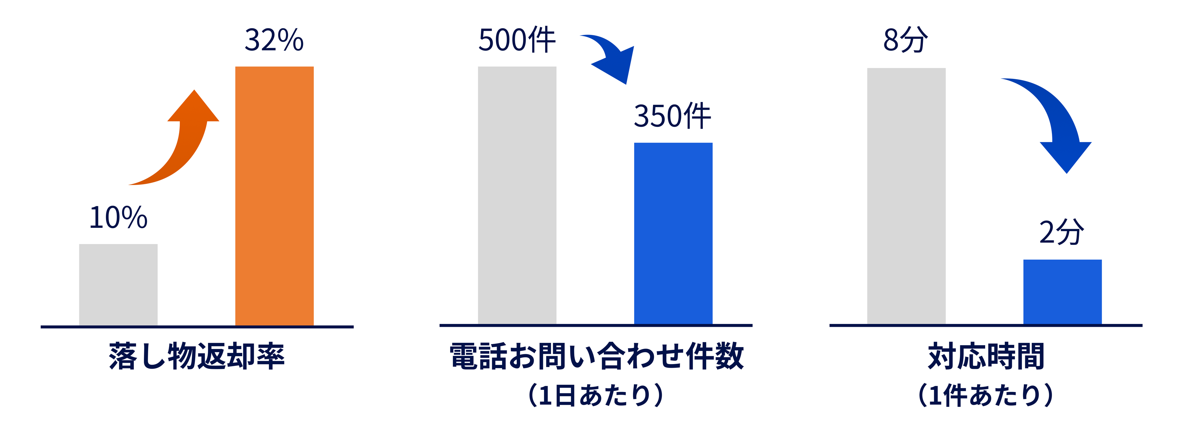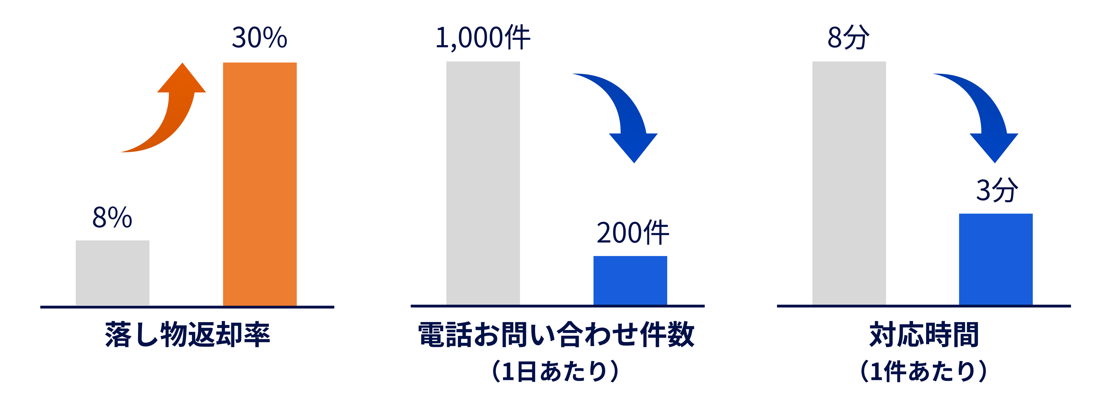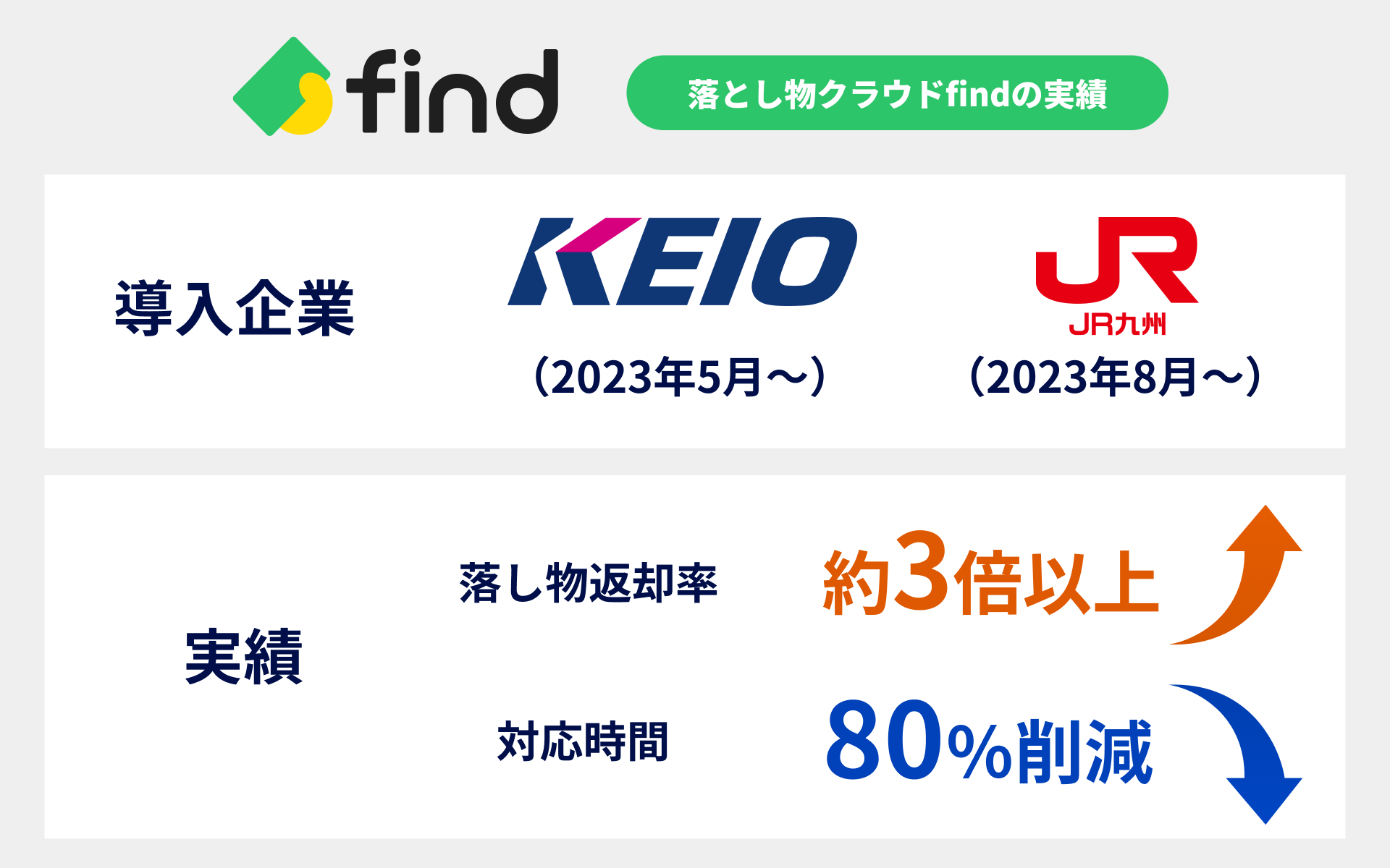 今回、京王電鉄、JR九州ともに、「find」の利用開始前と利用開始後の落とし物返却率を調査した結果、返却率が約3倍となっていることがわかりました。また、電話による落とし物の問い合わせ件数や対応時間の削減、落とし物の検品などのバックヤード業務にかかる作業時間の短縮なども見られ、業務効率化にも貢献しています。