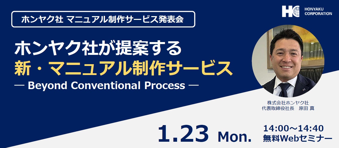 多言語翻訳サービスを展開する株式会社ホンヤク社(代表取締役:原田真)は、この度、マニュアル制作サービスをスタートすることを発表。AI翻訳での多言語展開を前提とした新たなマニュアル制作サービスとなる。あわせて、2023年1月23日(月)にはWebセミナー『ホンヤク社が提案する新・マニュアル作成サービス~Beyond Conventional Process~』と題してサービス発表会を開催予定。