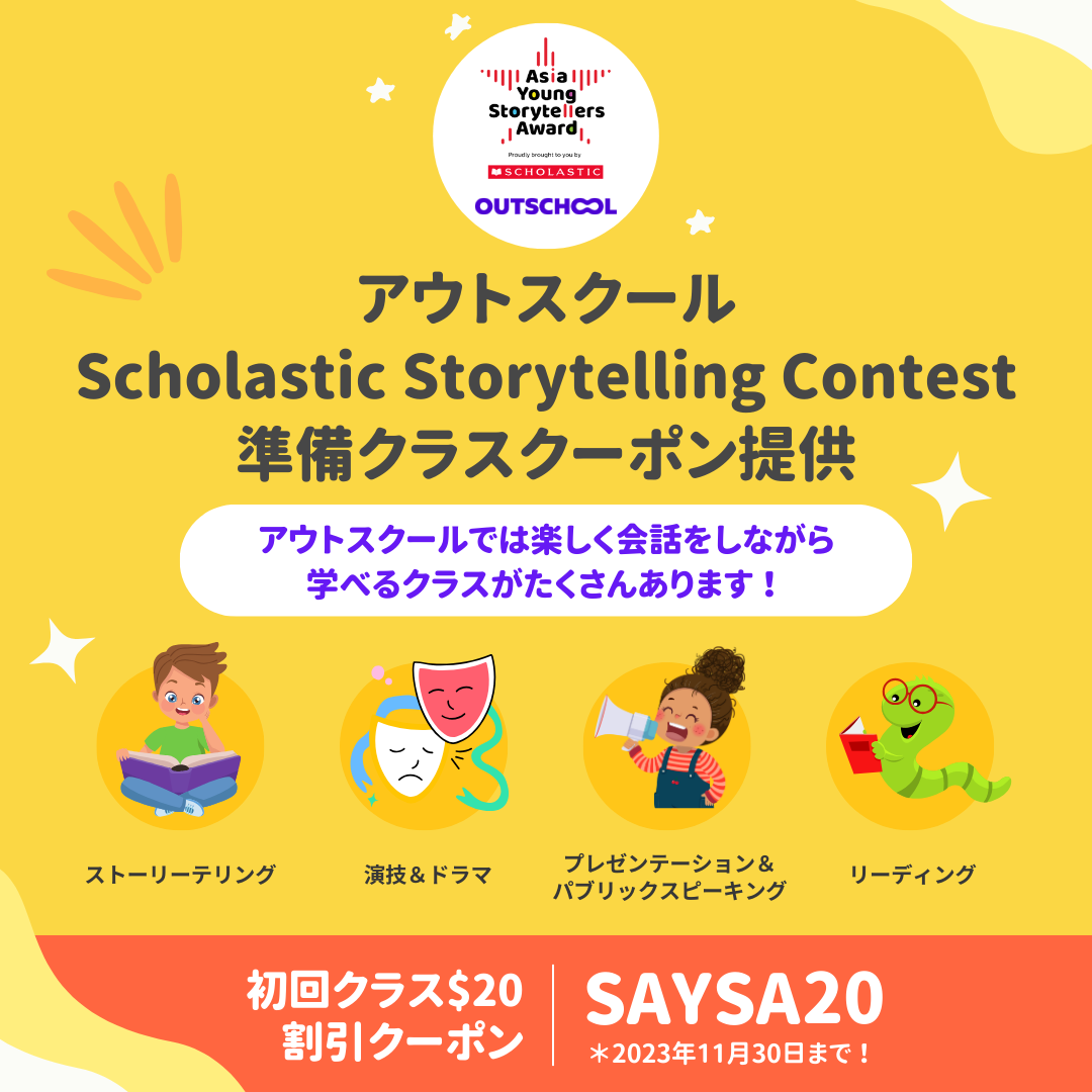 2023年10月23日 - 子供向けオンライン英語プラットフォーム「アウトスクール」が、100年伝統の世界最大規模の子供向け出版社Scholasticが開催する国際英語ストーリーテリング大会「Scholastic Asia Young Storytellers Award, SAYSA」の準備用クラスを提供することを発表しました。