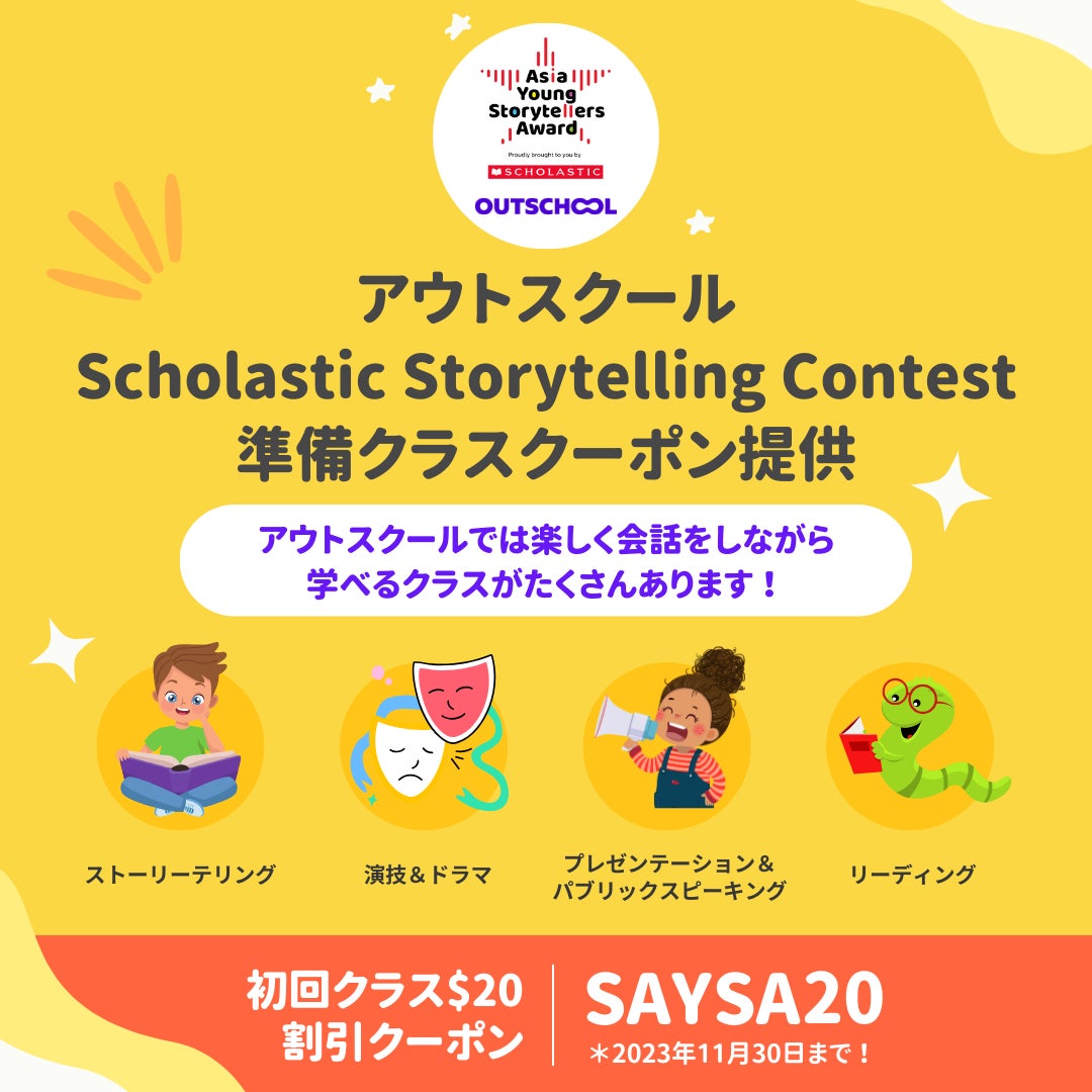 また、これを記念してアウトスクールは、スコラスティックストーリーテリングコンテスト関連授業を受講する生徒を対象に、$20(約3000円相当)の無料体験コード(SAYSA20)を提供するキャンペーンを行っています。