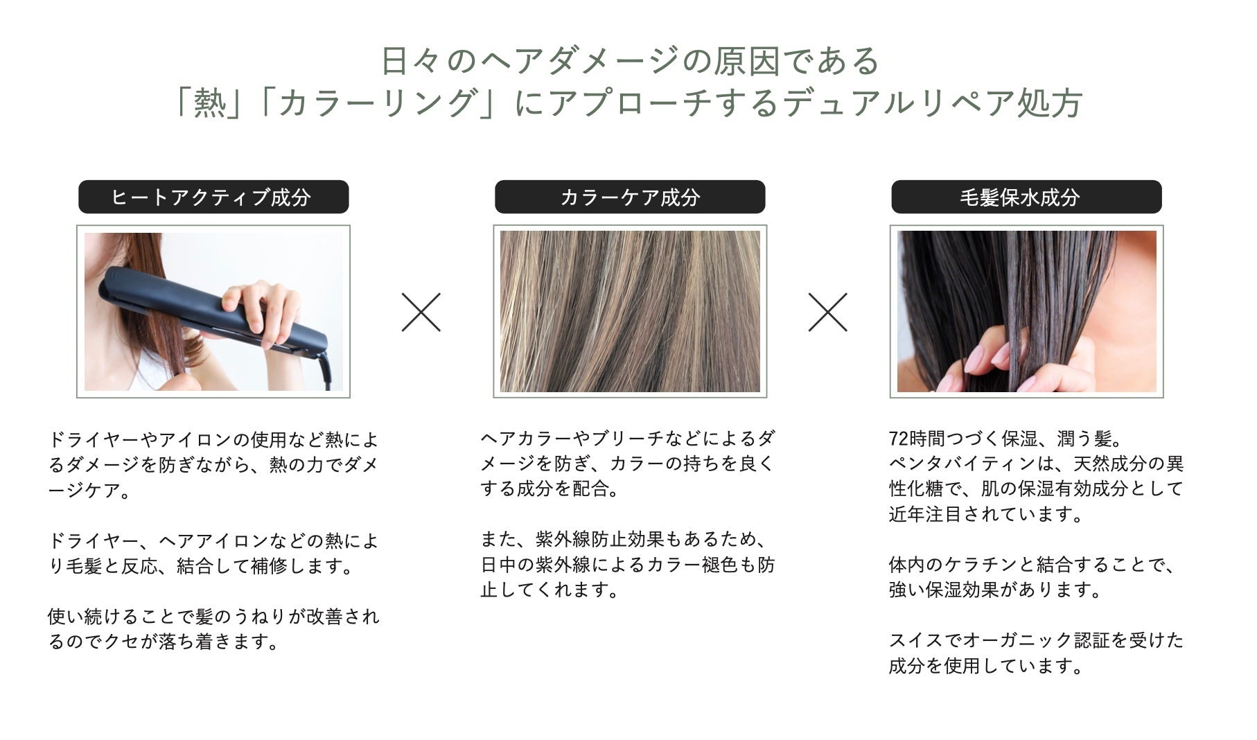 日々のヘアダメージの原因である 「熱」「カラーリング」にアプローチするデュアルリペア処方。