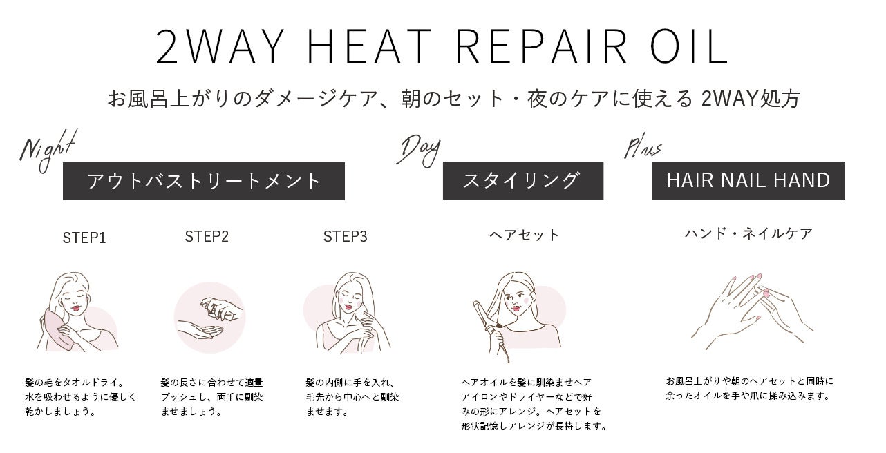 夜のダメージケア、朝のヘアセットとして使える万能ヘアオイル。独自の熱伝導処方で、きれいな髪型をつくり、キープ。 髪の表面を固めずにキープするので、スプレーやワックスで固めたようなガチガチにならず、しなやかさを維持しながら髪のセットが可能に。