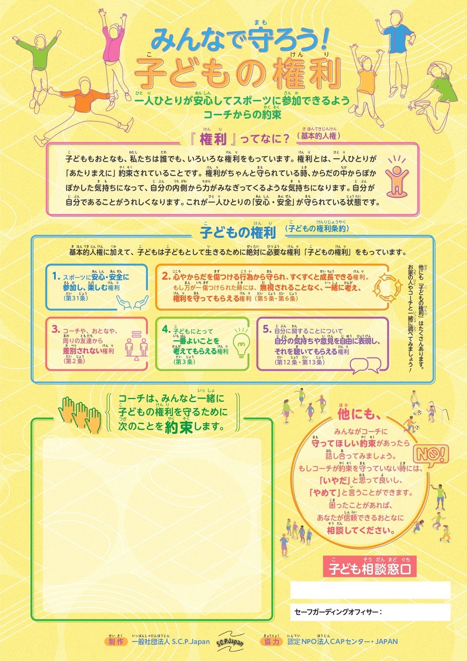 S.C.P. Japanでは、このリーフレットを活用して、活動に参加をするすべての子どもたちに「子どもの権利」と子どもの権利を守るための「コーチからの約束」について伝えていきます。そして、この約束がきちんと守られているかを子どもたちと常に見直し、子どもたちの力を借りながら、安心・安全な活動環境をつくっていきます。