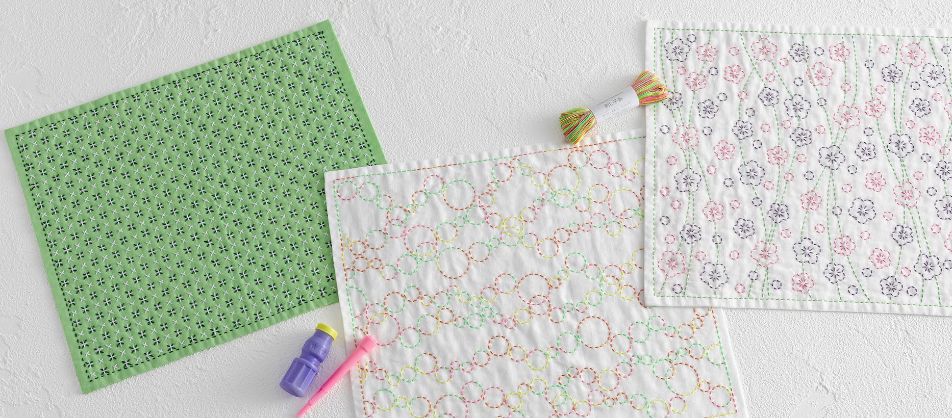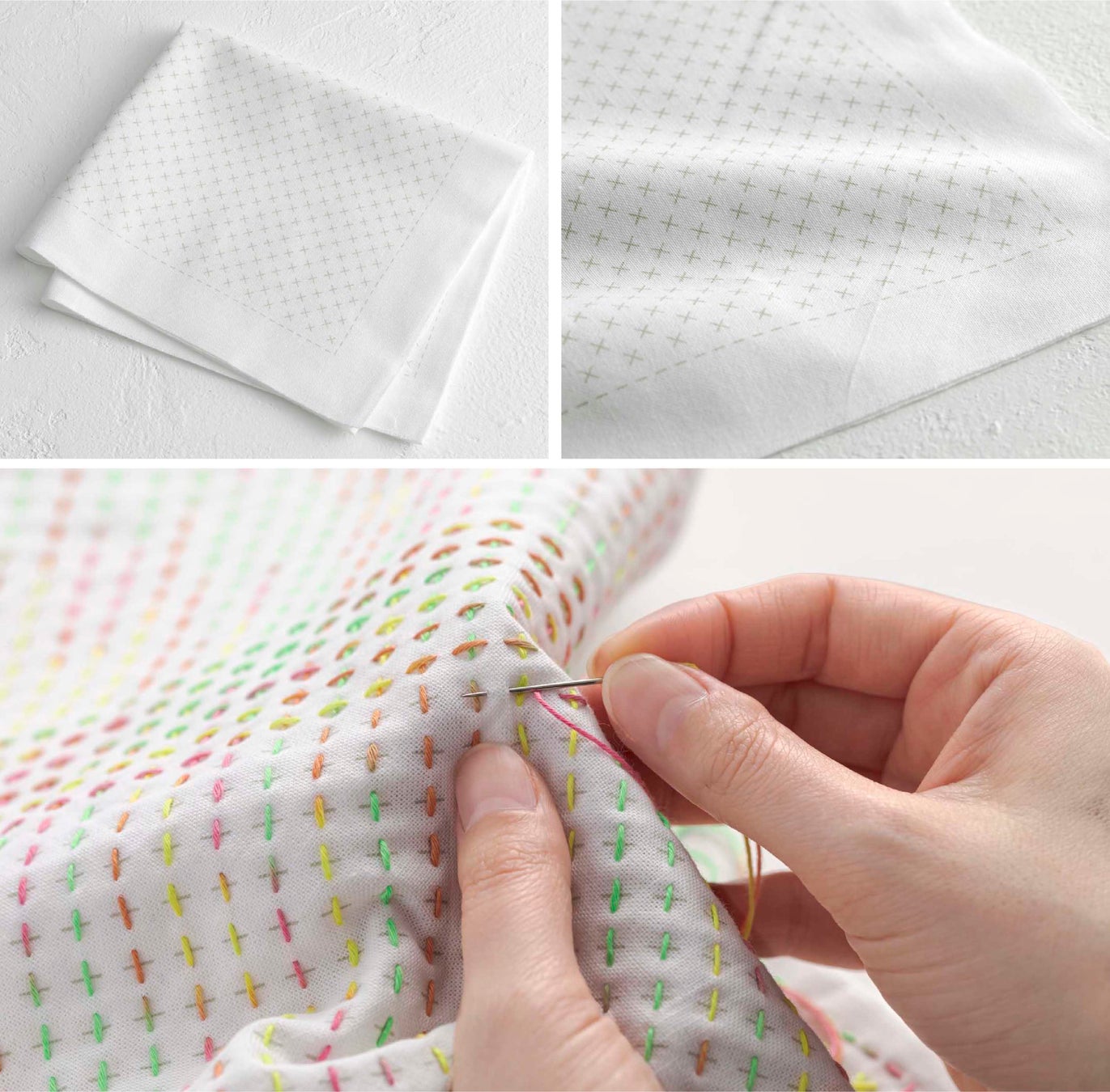 刺し子の技法をより簡単に楽しんでいただくために、水で薄くなるステッチ線を印刷したオリジナル布を使用しております。素材にこだわった柔らかな綿を使用しており、針通りも滑らかで心地良く刺すことができます。