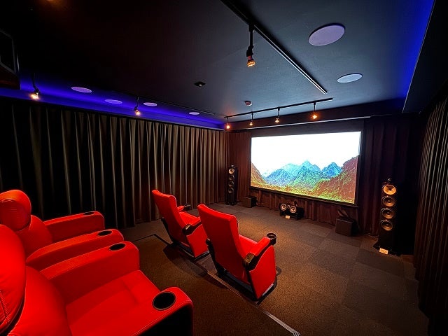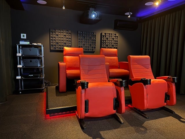 店内にはホームシアターの没入感(イマーシブ)を最も味わえる「専用室シアター」ルームを完備。完全暗室によりプロジェクターの性能を最大限発揮すると同時に、ひな壇に自社オリジナルのシアターチェアを配置した演出で、映画館さながらの雰囲気で映画作品やコンサート作品、配信映像などのコンテンツを楽しむホームシアター専用室を提案しています。