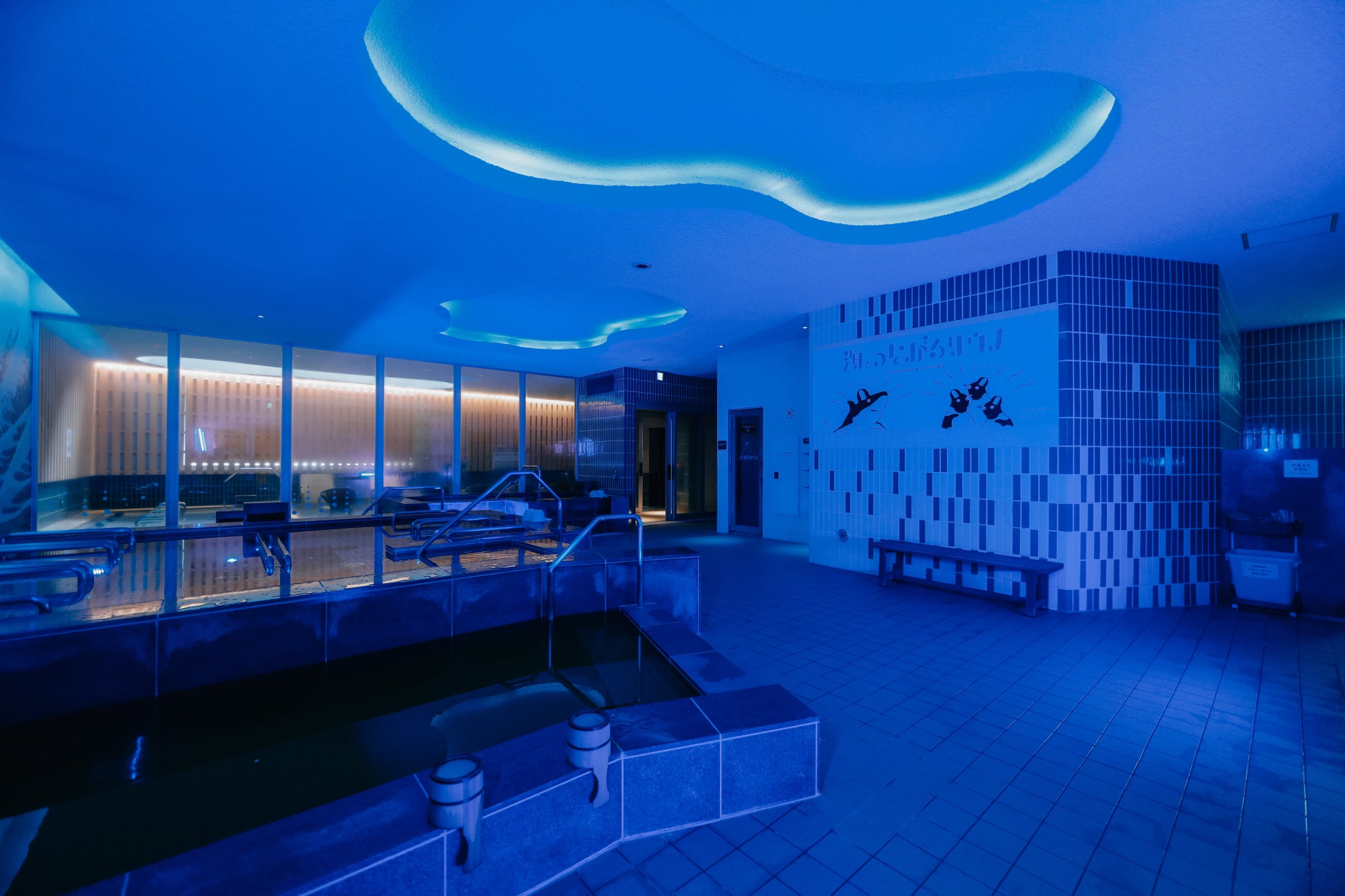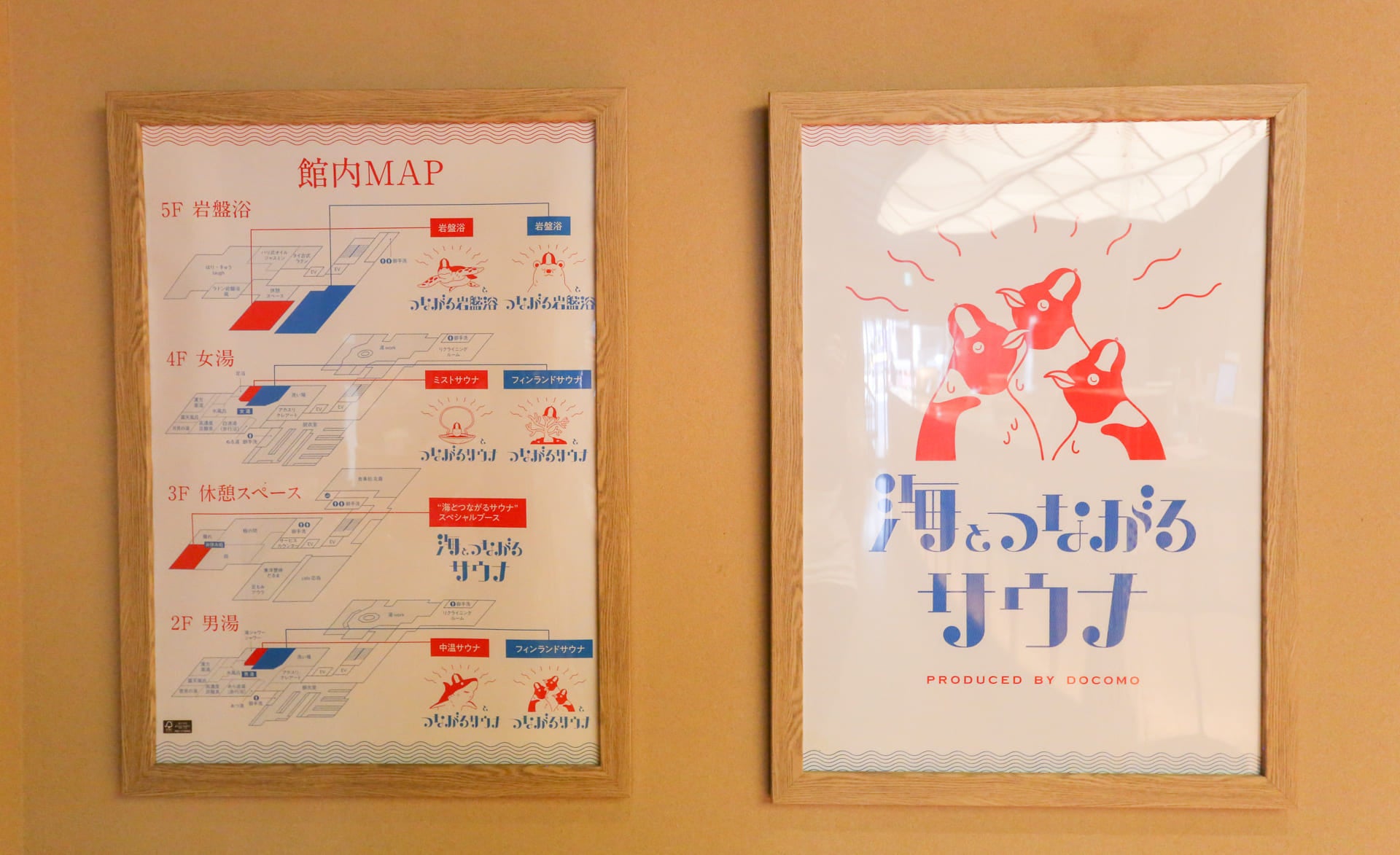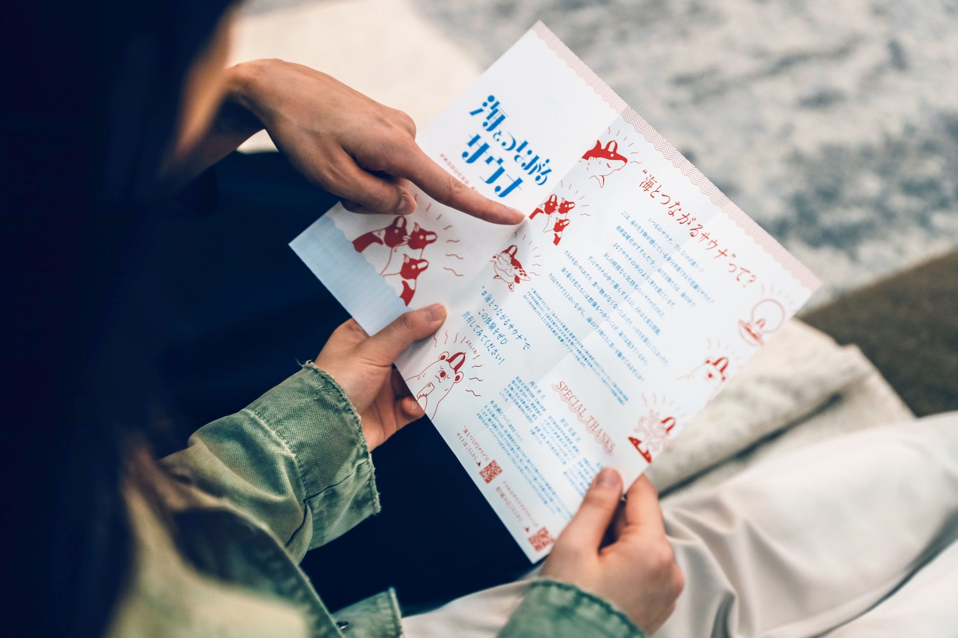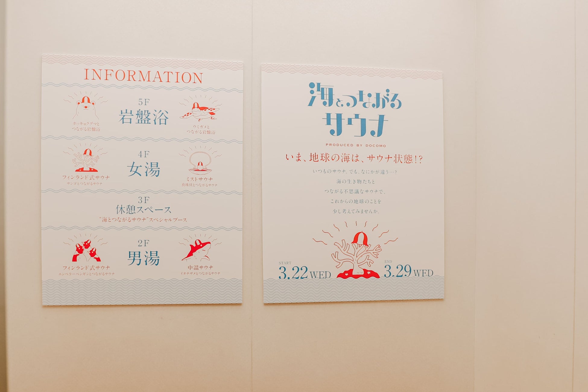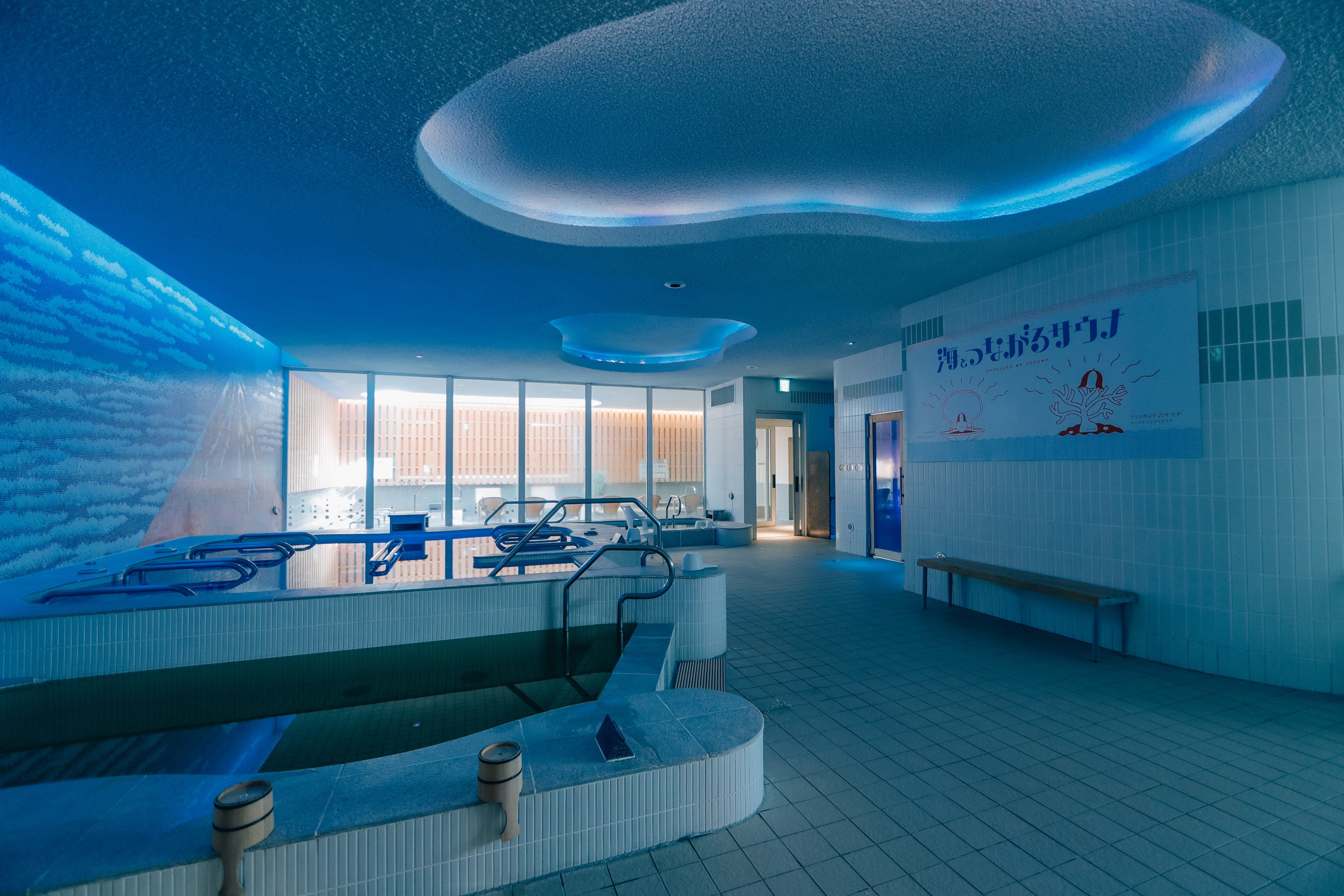 入口は「海とつながるサウナ」オリジナル暖簾でお出迎えし、一緒に写真を撮れるフォトパネルや、海の温暖化に関する展示などを設置しており、全館で「海とつながるサウナ」をお楽しみいただけます。ご来館いただいた方にはオリジナル施設案内をお渡しいたしますので、ご一緒にお楽しみください。