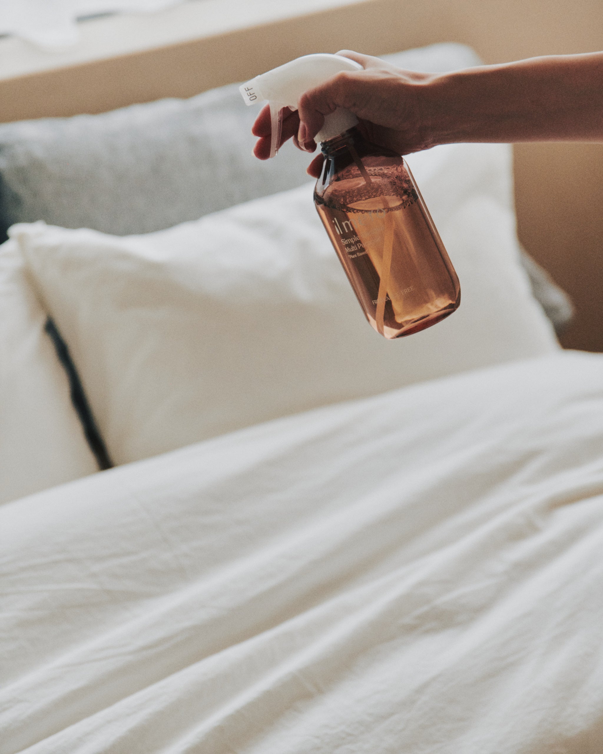 家中どこでもシンプルにこれ1本でお掃除が可能です。油まみれのフライパン、タッパー、魚焼きグリルなどにシュッと吹きかけて、少し置いてから洗い流すと驚くほどベタつきがなくなります。魚臭さの消臭などにも優れています。衣類の汗シミや血液汚れの除去には吹きかけてから洗濯機で洗ってください。また、除菌効果もあるので、壁やシンク周り、浴槽、トイレなど様々な場所のお掃除にお使いいただけます。