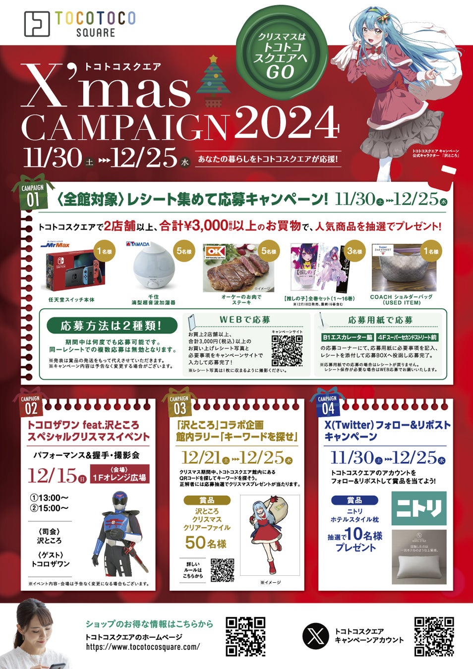 西武鉄道所沢駅西口徒歩6分にあるトコトコスクエア(埼玉県所沢市)は、2024年11月30日(土)から12月25日(水)までの期間、「X'masキャンペーン 2024」を開催いたします。