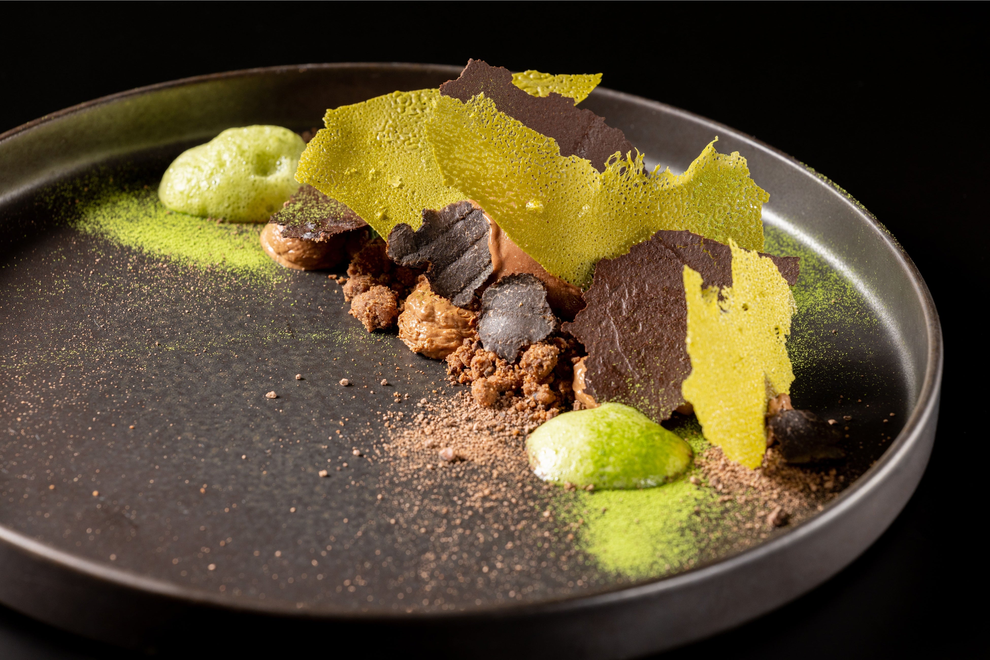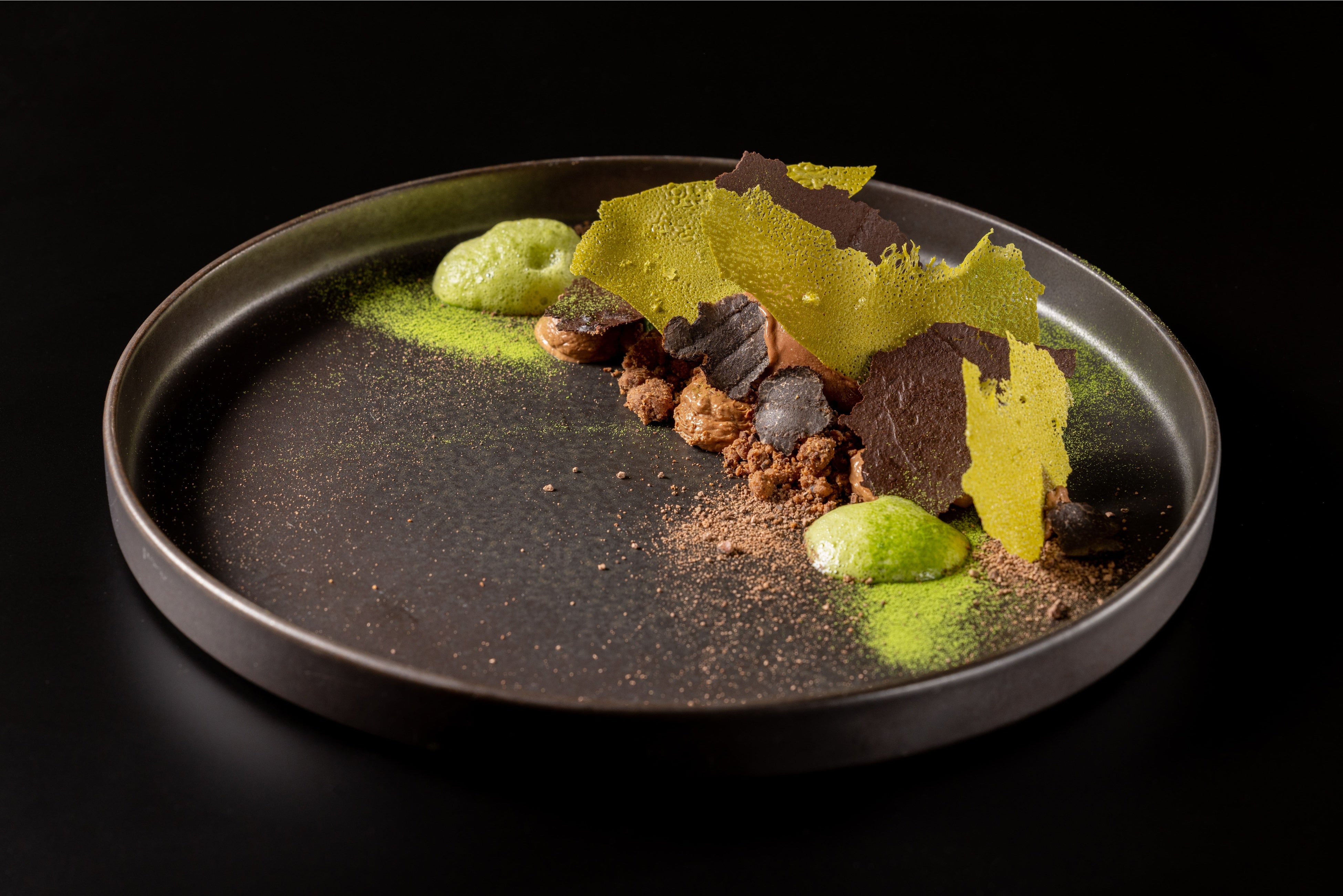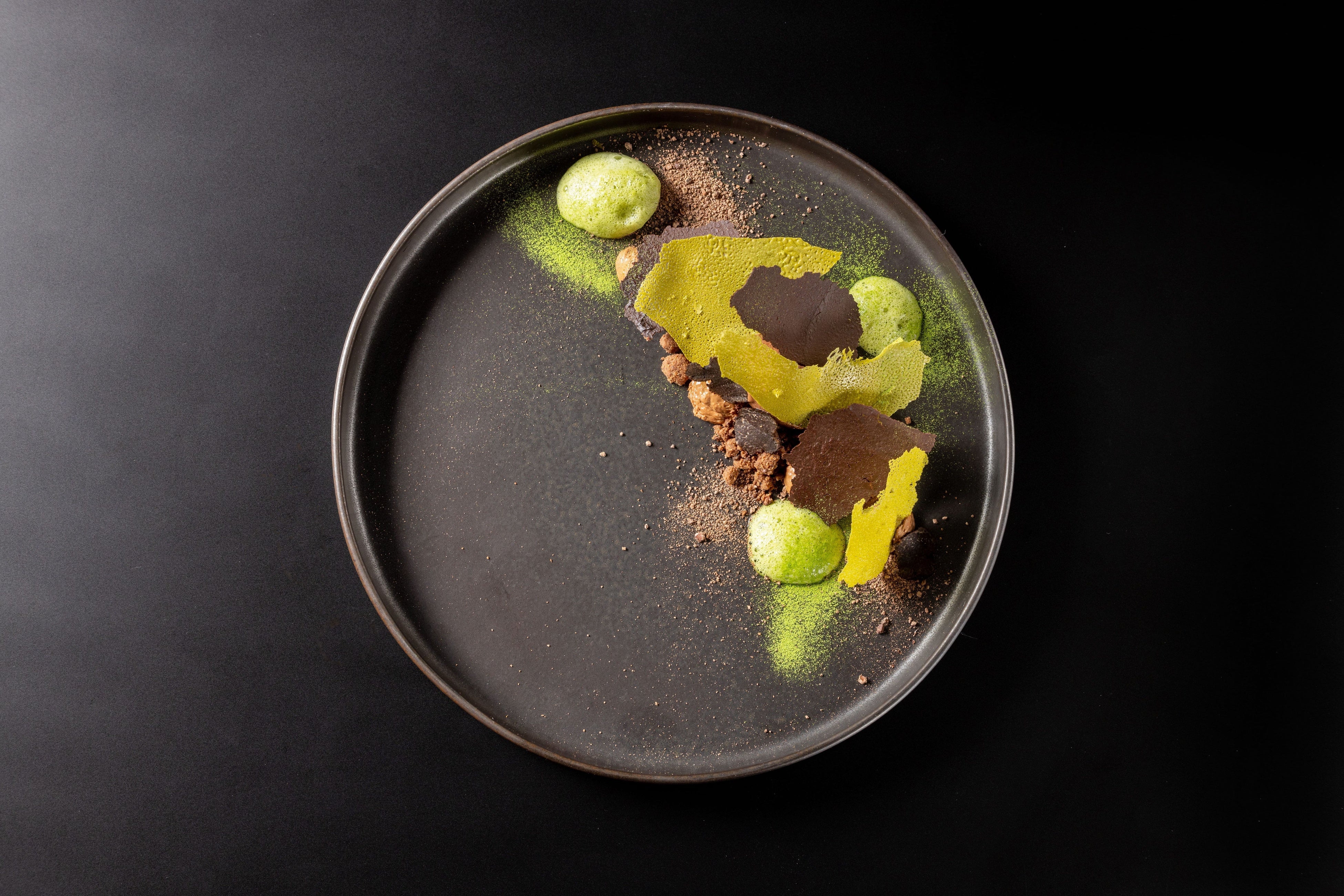 カカオクリーム、カカオソルベ、カカオクランブル、抹茶のチュイール、抹茶のフォーム、パッションフルーツのソース、トリュフスライス