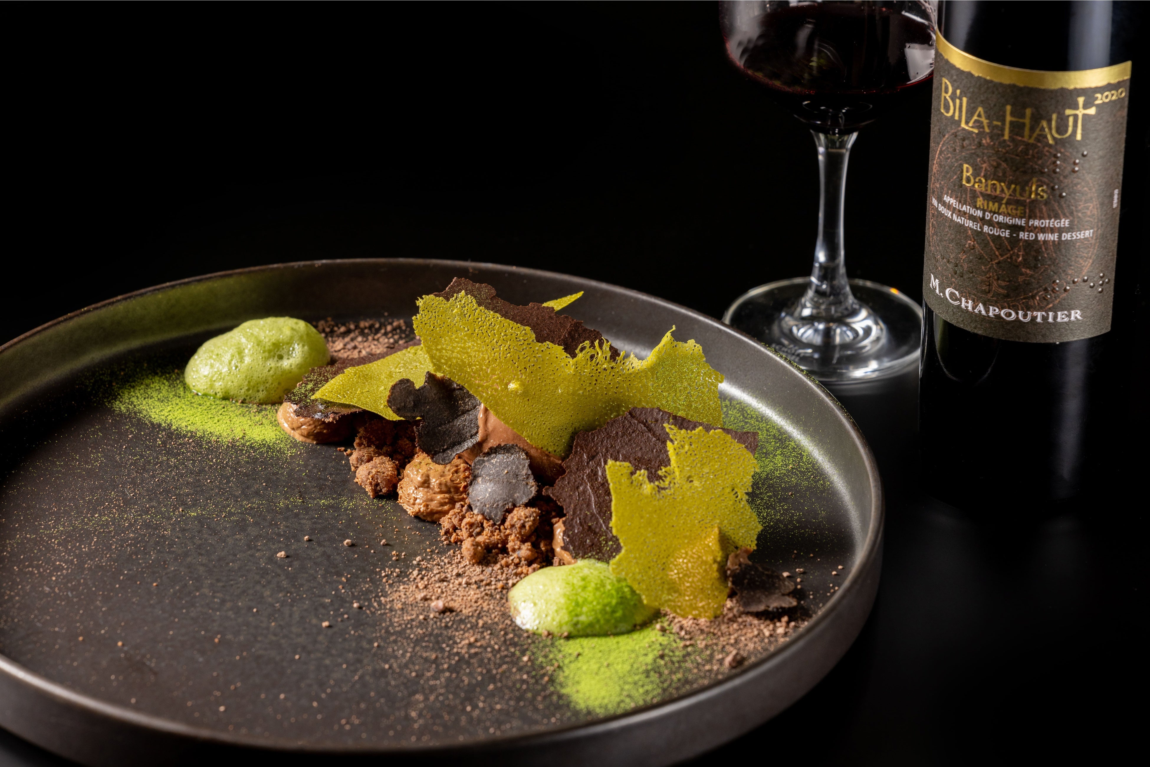 ショートケーキの原型と言われているフランスのお菓子「クルスティアン」をベースに、カカオ70%のハイカカオチョコレートを使用したフルーティで酸味のあるソルベと、香り高い黒トリュフのスライスをあしらった贅沢な一皿に仕上げました。プルマン東京田町のエッセンスとして、お抹茶を茶筅(ちゃせん)で点てたような抹茶の泡と、抹茶のチュイールがアートな大人心をくすぐります。世界一チョコレートと合うといわれる甘口の赤ワイン「バニュルス」と共に、大人の甘い余韻をお楽しみください。