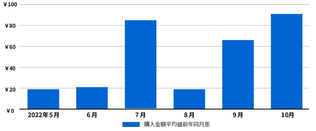 - 購入合計金額からみる:今年10月は前年差、平均購入金額92円上昇