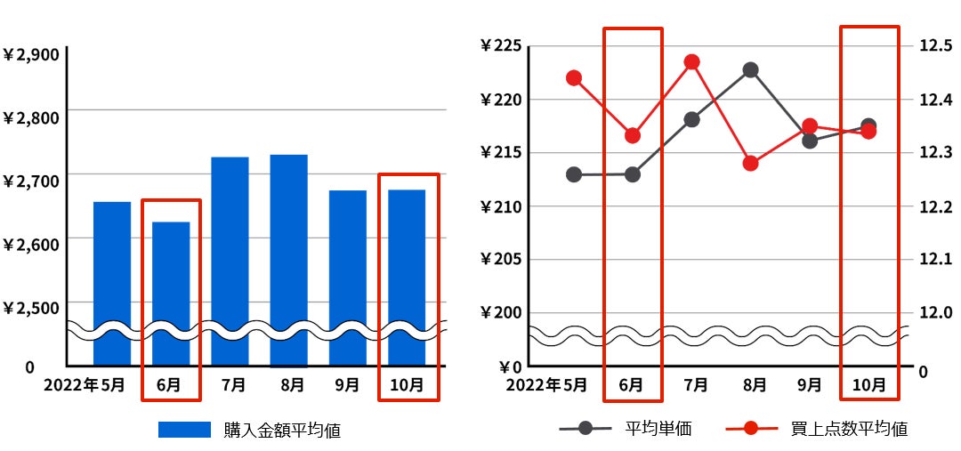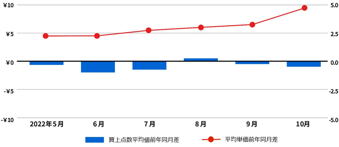 最新の全国買い物データによる平均購入金額、買い上げ点数、時間帯を徹底調査!買い上げ点数は変わらず、購入単価が約2%増!(※2022年6月と同年10月比較)値上げ影響じわり負担に