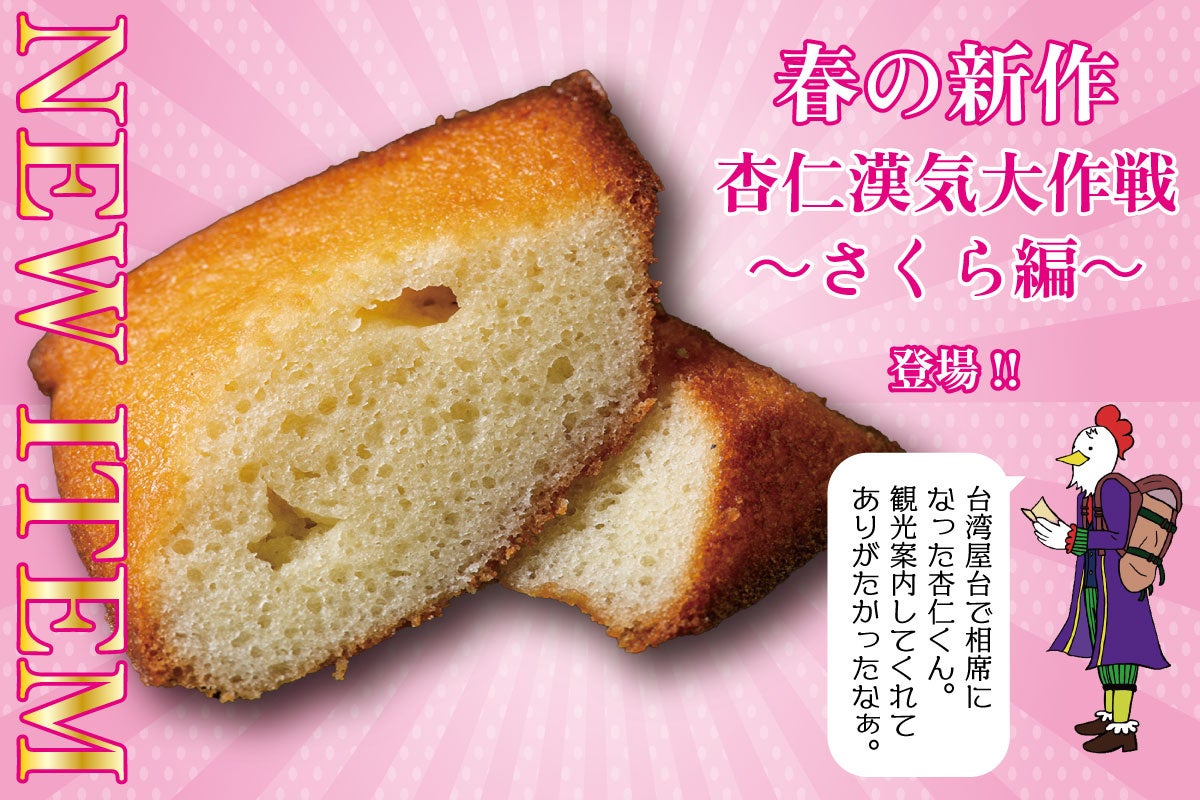 待望の新フレーバーは杏仁の爽やかな甘味と風味で人気の<杏仁漢気大作戦~さくら編~>1個340円。各催事やネットショップでも販売していますので、是非!
