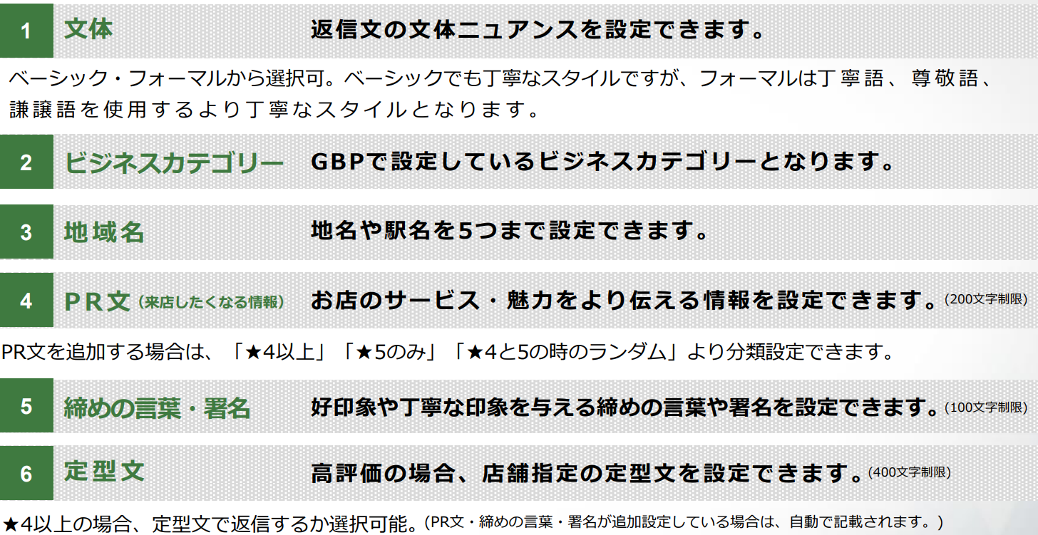 クチコミ返信文の文体変更(ベーシック/フォーマル)やMEO対策に必要な地域キーワードの設定が可能です。