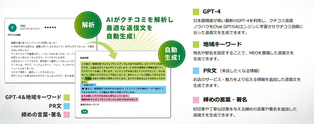 独自のクチコミ返信ノウハウにより、 クチコミ内容解析から地域キーワードを追加した返信文構成を自動化。