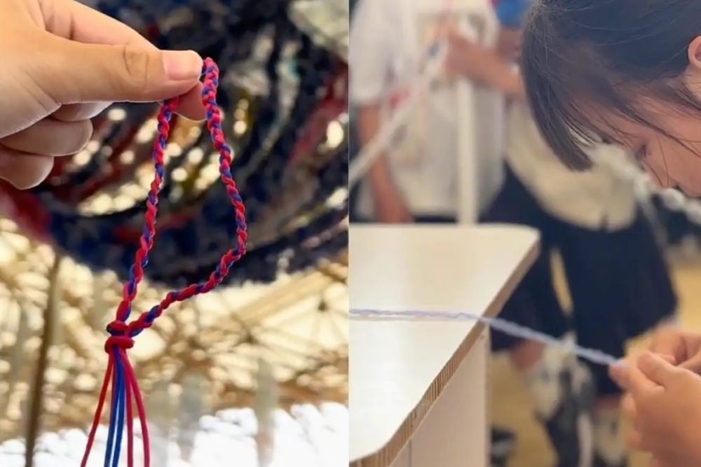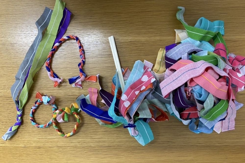 大阪の堺の伝統産業「和晒の手ぬぐい」の端材を使用してミサンガやミニハタキを作ります。(所要時間10分)