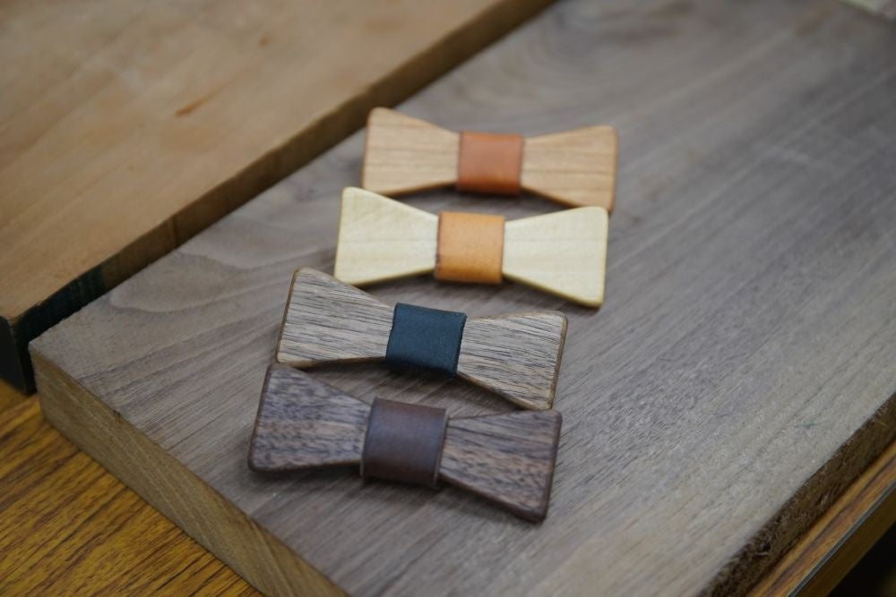 「触れる・磨く・香る木工」をテーマに、木製の蝶ネクタイづくりを体験できるワークショップ。研磨作業やオイルがけなど、目と鼻で木をお楽しみください。(所要時間30分)