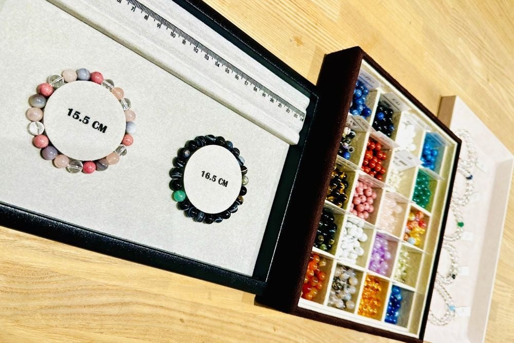 二十数種類ある丸玉から好きな石を選び、シリコン製のゴムに通してブレスレットを製作します。(所要時間30分)