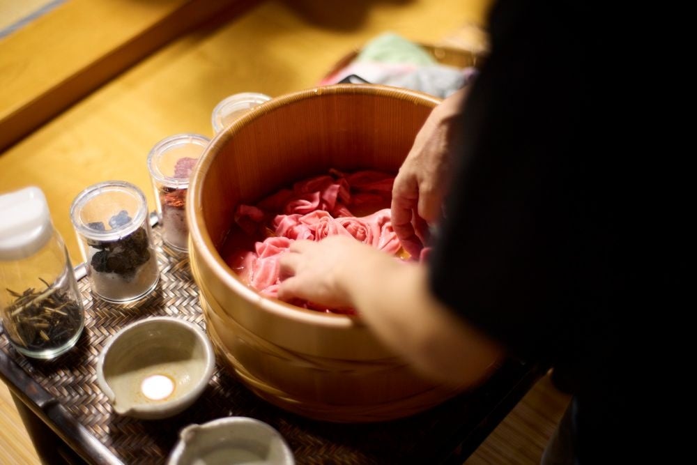ハンカチを好みに絞り、新田の伝統的な紅花染めを体験できるワークショップ。(所要時間 30分)