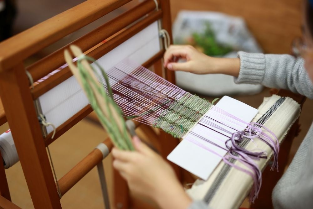 手織りの織機を使って12cm四方の裂き織りのコースターを作ります。パタンパタンと手を動かして山梨の先染め織物を織ってみましょう。(所要時間30分)