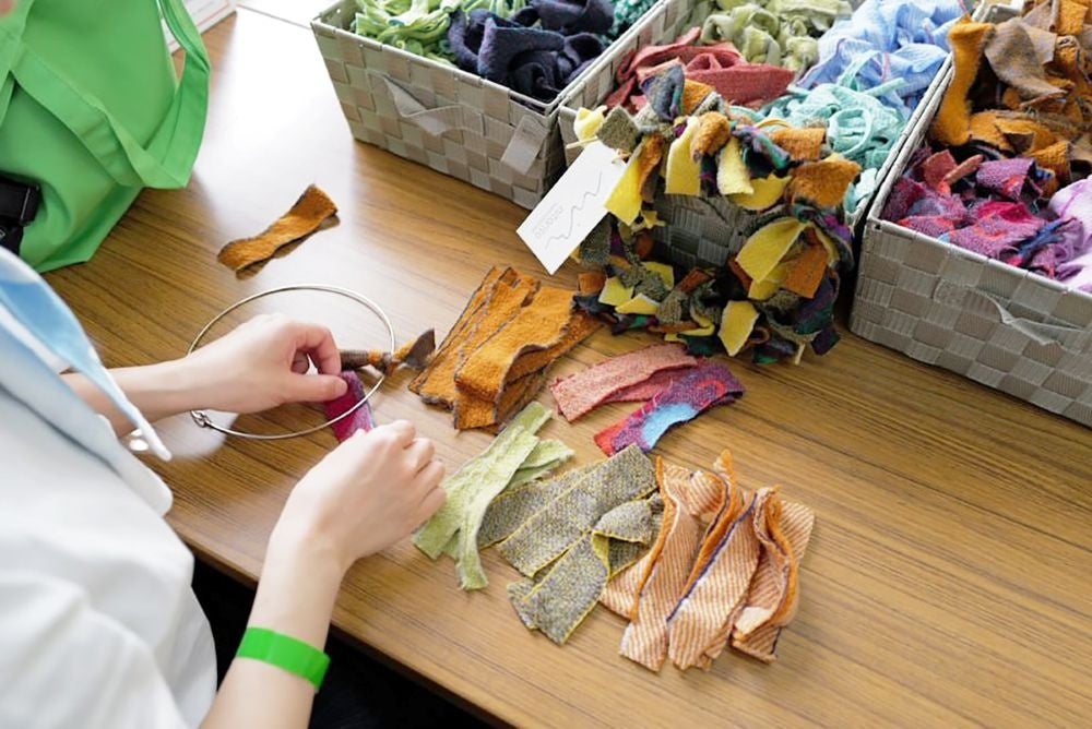 山形県米沢市を拠点とするテキスタイルブランドnitoritoのストールをつくる過程で生まれた、色とりどりのニットの端切れを使って、世界にひとつだけのリースをつくります。(所要時間30分)