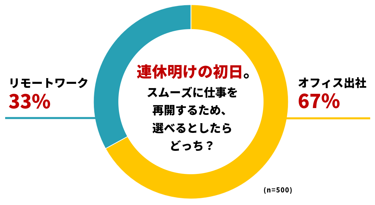 つづいて、スムーズに仕事を再開するために「オフィス出社」と「リモートワーク」のどちらを選ぶかを訊いたところ、「オフィス出社」が67%、「リモートワーク」が33%という結果となりました。