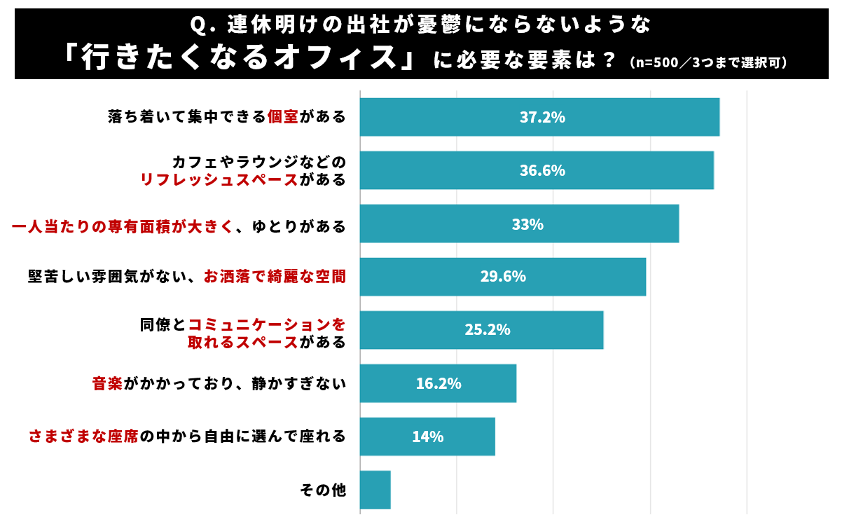 Q4. 連休明けの出社も憂鬱にならないような、「行きたくなるオフィス」にするためにはどんな要素が必要だと思いますか。